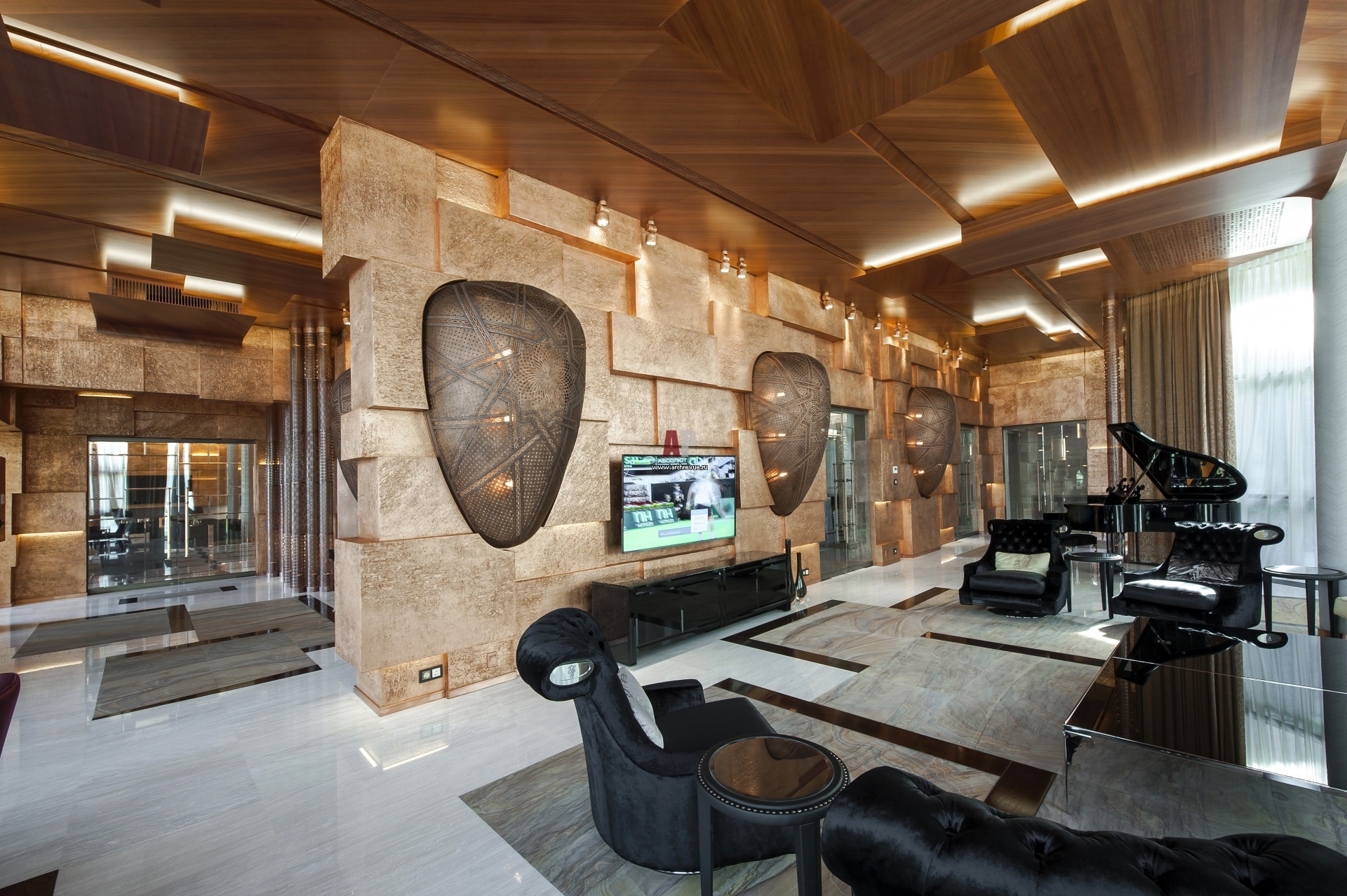 Стены гостиной отделаны разномасштабными выступающими кубами, подсвеченными с торцов LED–лентами. Потолок оформлен деревянными панелями, размещенными на разных уровнях. С ними рифмуется рисунок каменного пола со вставками из ореха. Кресла, журнальный столик, Visionnaire.