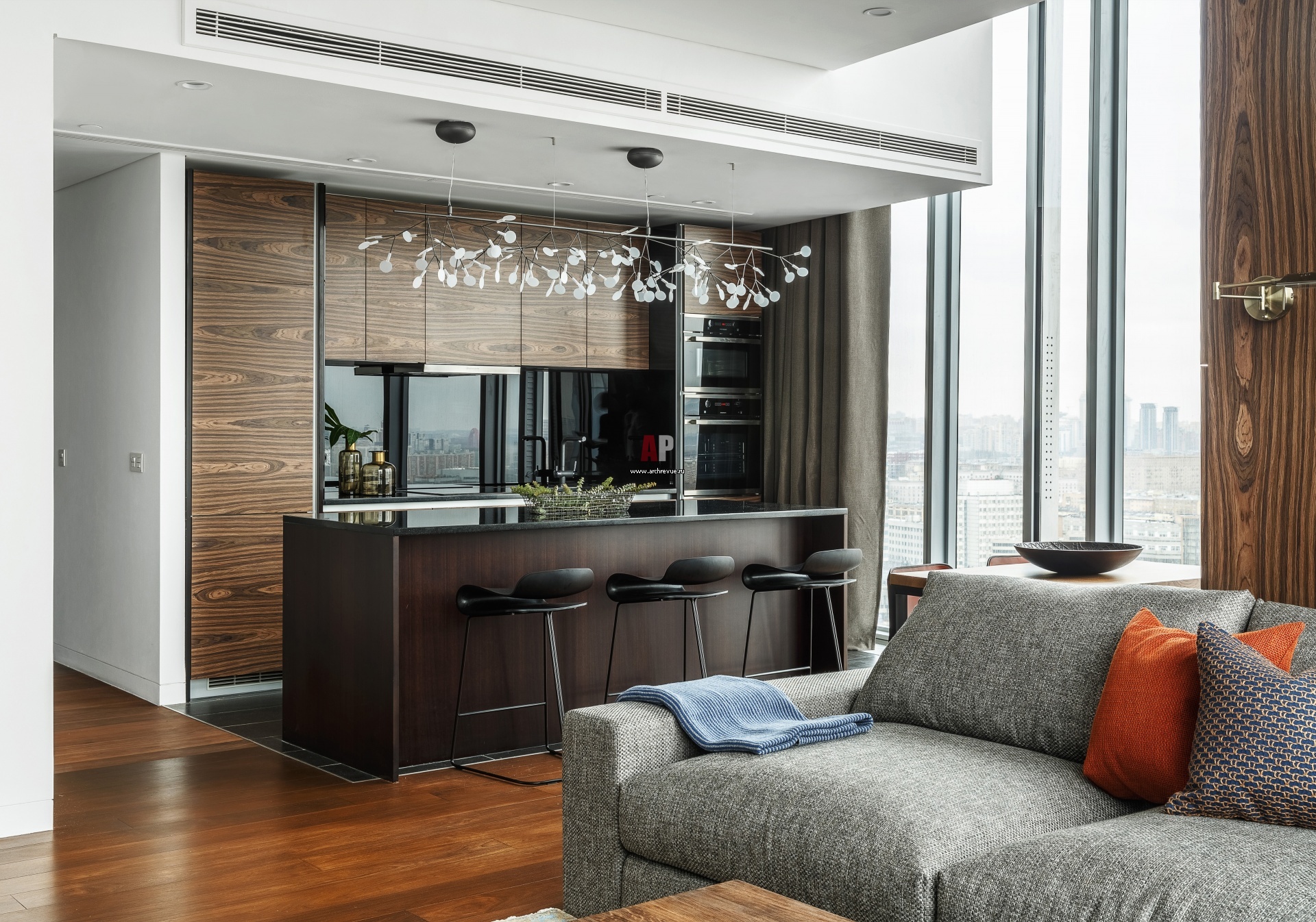 Кухня объединена с гостиной. Гарнитур с закрытыми фасадами из шпона европейского ореха изготовлен по эскизу дизайнера. Фартук выполнен из черного стекла. Барные стулья, Kristalia.