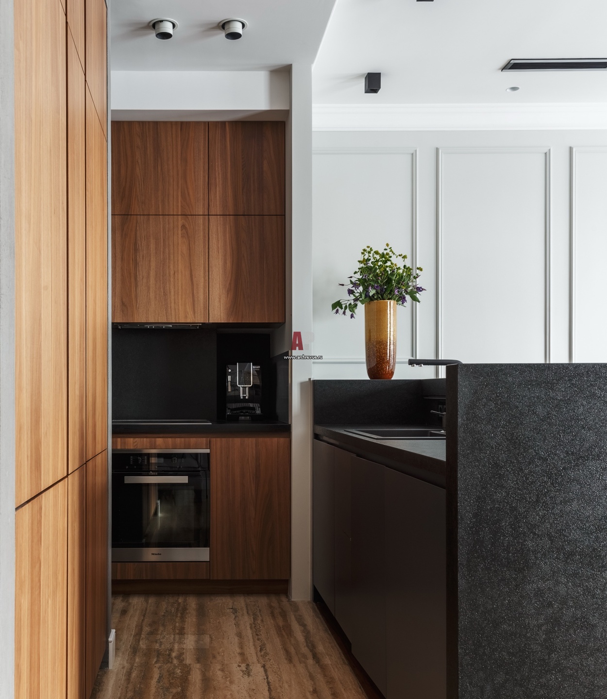 Со стороны гостиной в барную стойку встроен винный холодильник (он скрыт за фасадами из шпона американского ореха), с обратной стороны внизу бара расположены ящики для хранения.