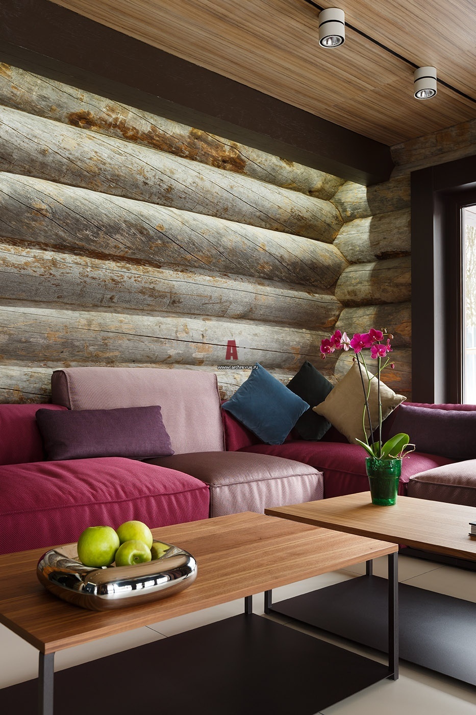 Интерьер гостиной. Интересно оформлена зона примыкания бревна кело и потолка, подшитого панелями под дерево.