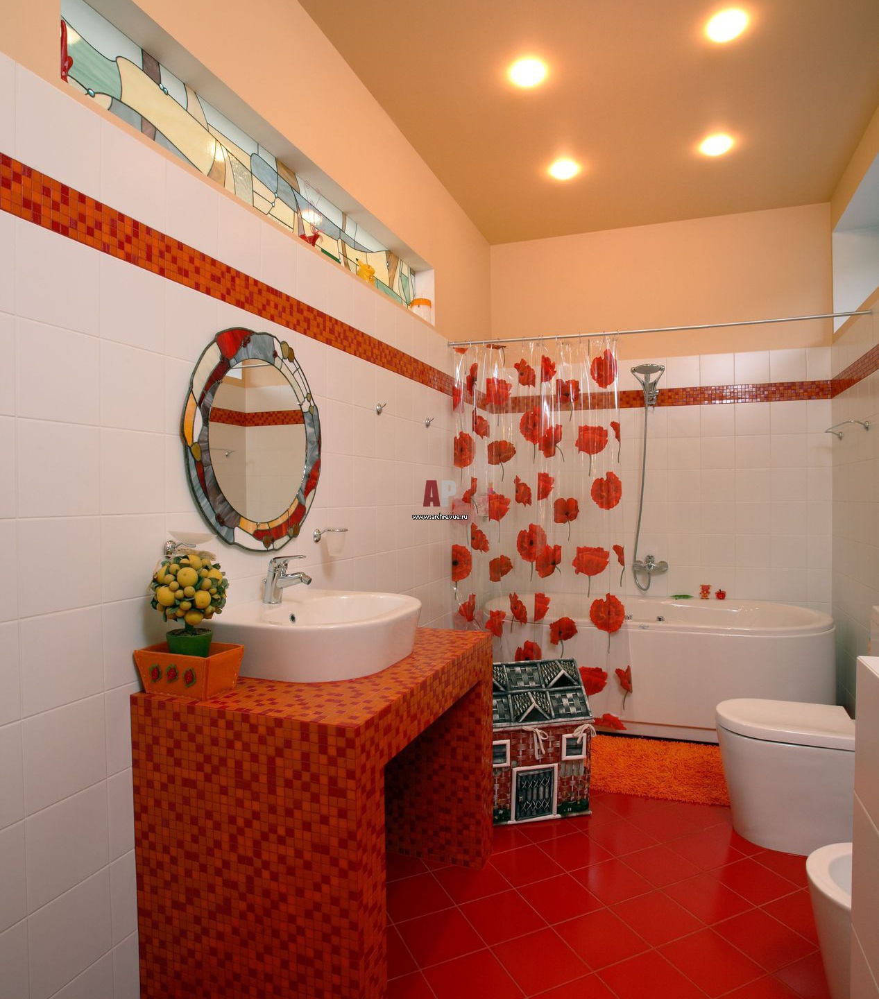 Гостевой санузел декорирован красной мозаикой и шторой с маками. Горизонтальный витраж и рама зеркала сделаны по индивидуальному дизайну мастерами компании «Лаборатория дизайна».