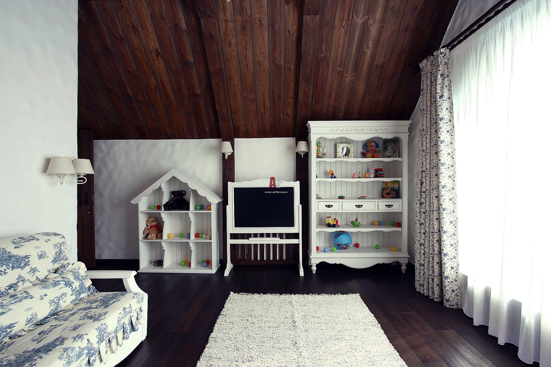 Интерьер детской комнаты на втором этаже дома. Контрастное сочетание светлой штукатурки и темных досок делает облик дома в баварском стиле очень выразительным и аутентичным.