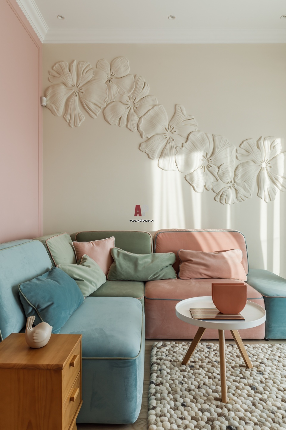 Украшение зоны отдыха в детской старшей дочери – гипсовое цветочное панно над диваном, GkerStudio.