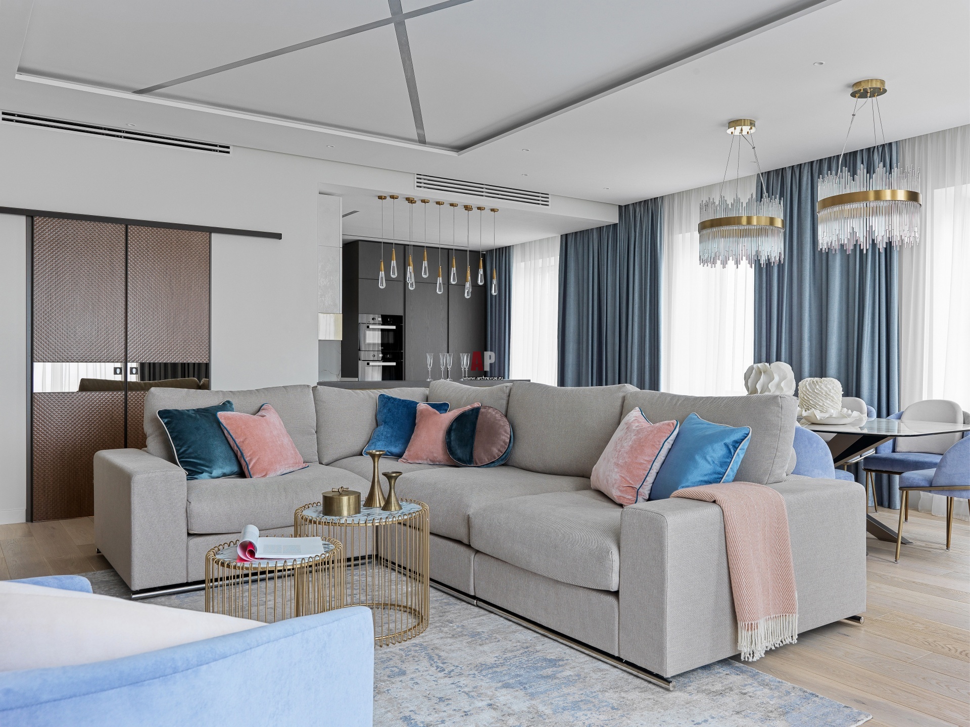 Гостиная в пастельных тонах. На стенах – бархатная штукатурка. Обивки и шторы выполнены в нежных голубых и розовых оттенках. Диван, Estetica. Журнальные столики, Cazarina Interiors.
