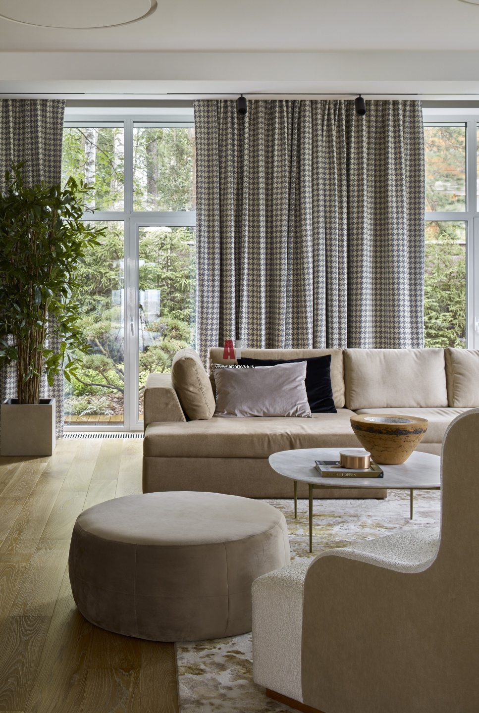 Гостиная. Мягкая мебель обтекаемых форм сделана на заказ. Рисунок штор разработан Антониной Синчуговой.