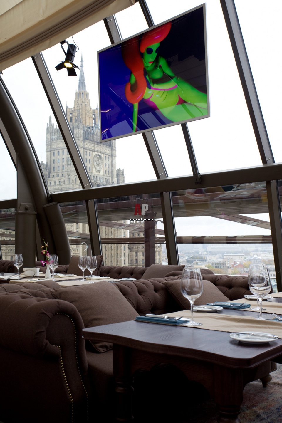 Фрагмент интерьера верхнего зала ресторана, исполненного в стилистике сказки «Алиса в Стране чудес». Мебель изготавливалась на заказ в Москве, частично привезена из Голландии и Америки.
