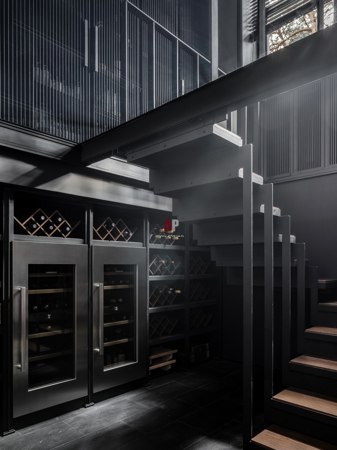 Особенность дома – необычная винотека с винным погребом. Она расположена в цокольном этаже под кухней и отделена плитой из закаленного стекла. Мебель сделана по чертежам.