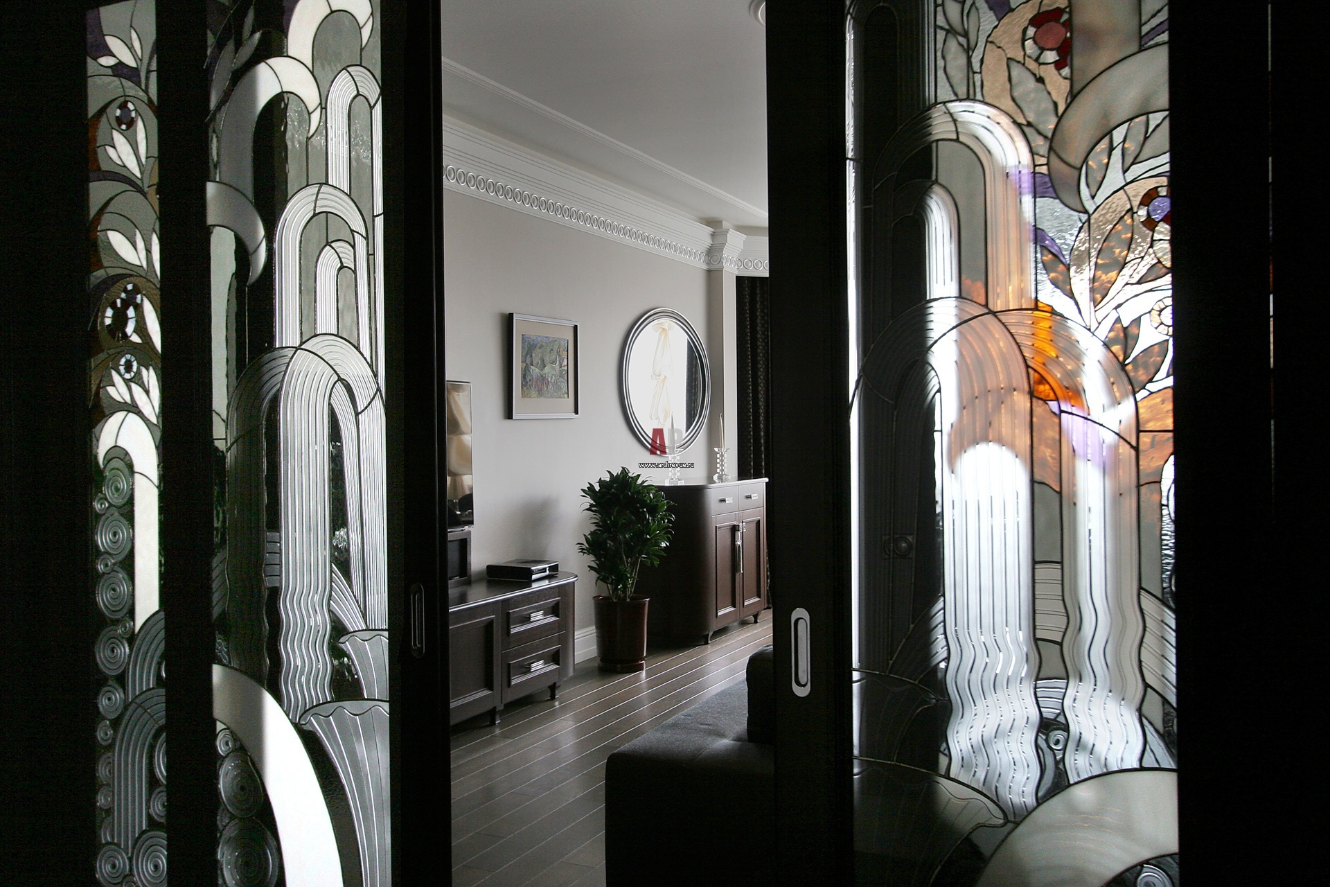 Вид из коридора на гостиную. Витражные панели, на заказ, изготовление «Александрия».