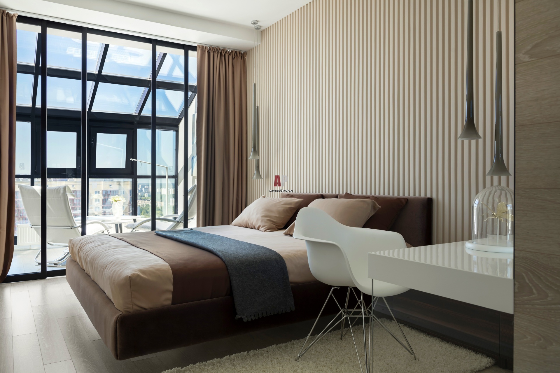 Из хозяйской спальни сделан выход в зимний сад, помещения разделяет стеклянная перегородка. Стена за изголовьем кровати отделана гипсовыми 3D панелями с имитацией деревянных реек. Подвесные светильники, Vistosi.