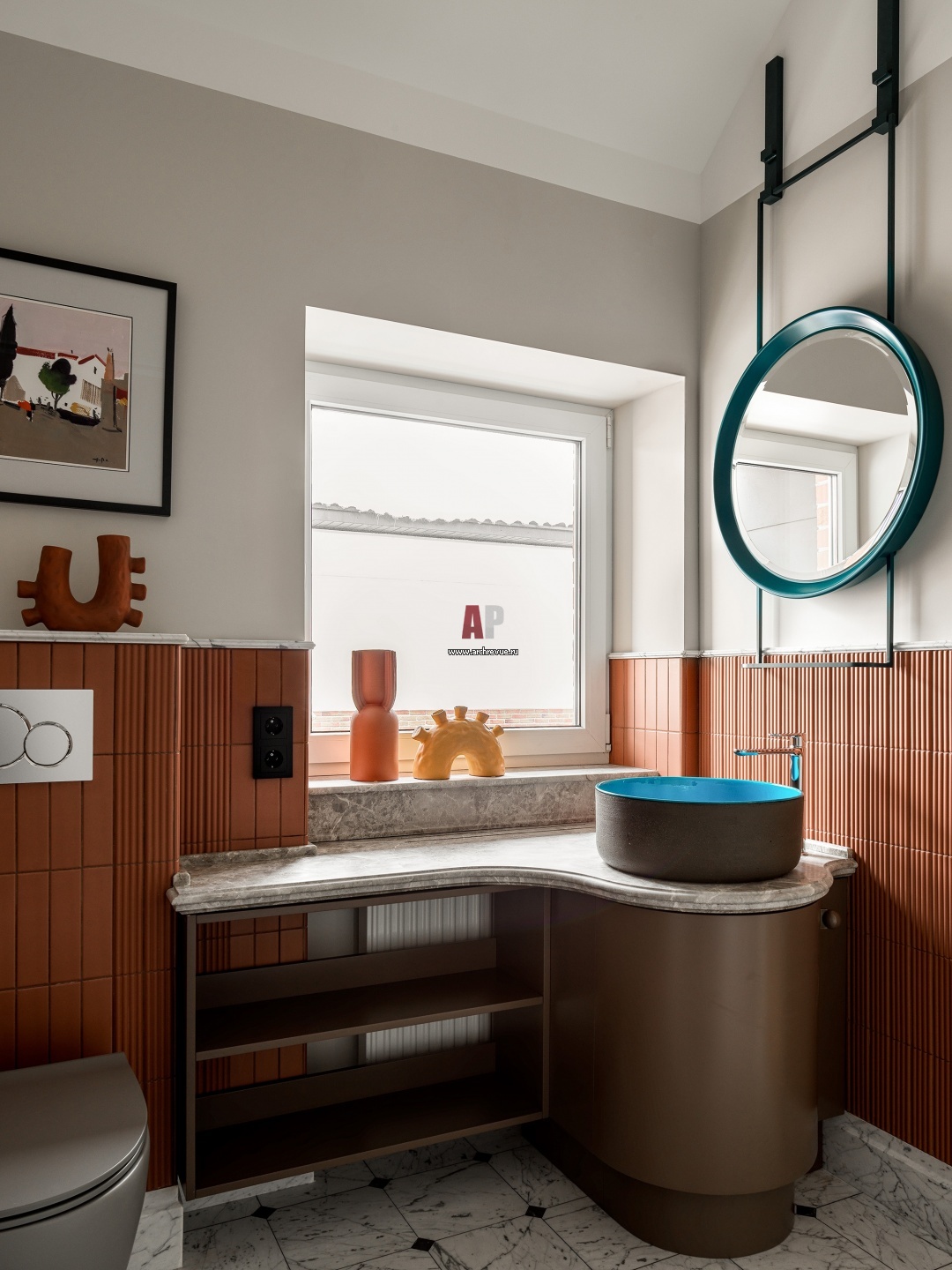 Детский санузел оформлен в контрастных охристых и бирюзовых оттенках. Тумба под раковину и навесное круглое зеркало сделаны по авторским чертежам. Плитка, Equipe Ceramicas. Картина художника Алексея Ланцева.