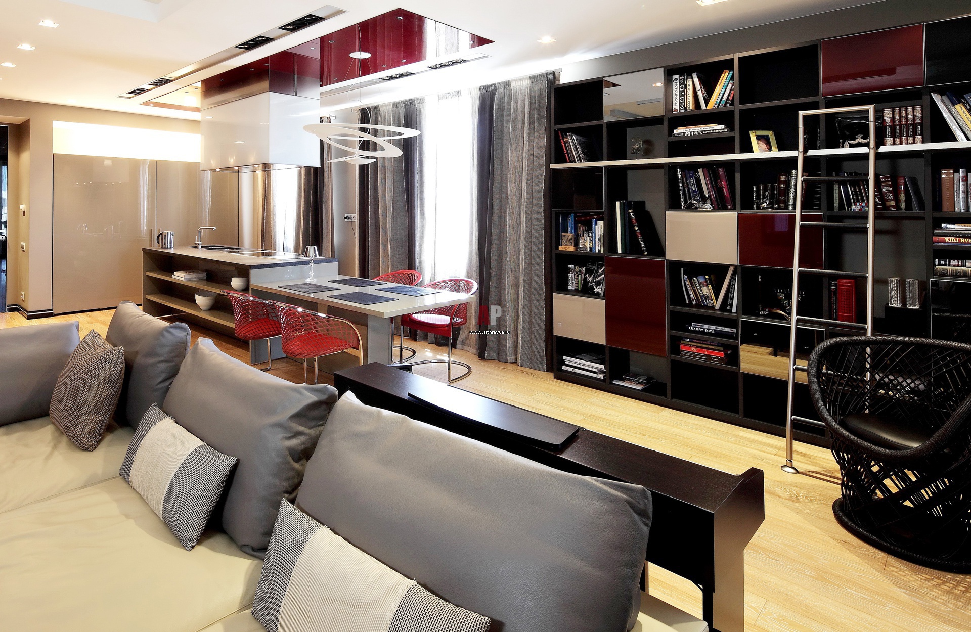 Фото открытого помещения гостиной. В едином пространстве находятся разные по назначению зоны: домашний кинотеатр, мягкая группа, библиотека, столовая и кухня. Зонирование осуществляется с помощью сходной по дизайну мебели, натяжного потолка рубинового цвета и цветовых акцентов.