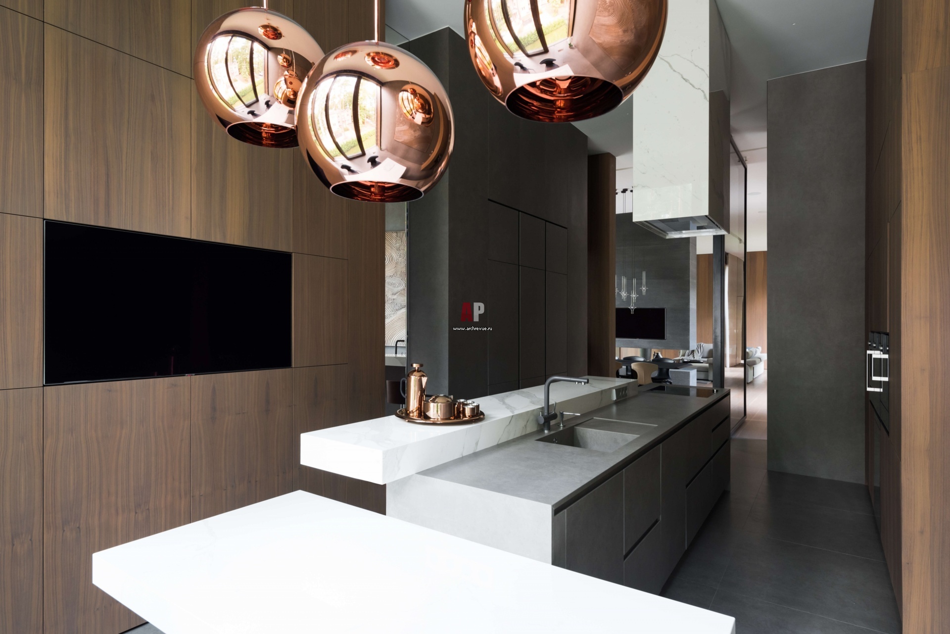 Кухня. На стенах и полу крупноформатные керамические плиты Laminam из коллекций I Naturali, Pietra di Savoia Grigia Bocciardata. Светильник, Tom Dixon.