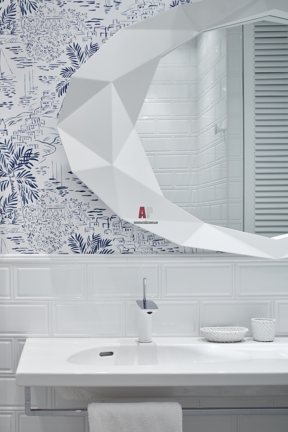 Семейная квартира в стиле американской классики. Интерьер ванной комнаты. Обои, Ralph Lauren. Зеркало, Deknudt Mirrors. Раковина, Laufen. Смеситель, Hansgrohe.