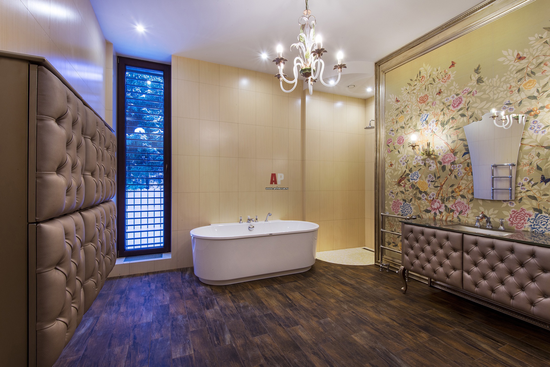 На фото – интерьер женской ванной комнаты. Керамическое панно с цветами Novoceram обрамлено золотым гипсовым багетом от Orac Decor, поставщик «Ампир Декор».