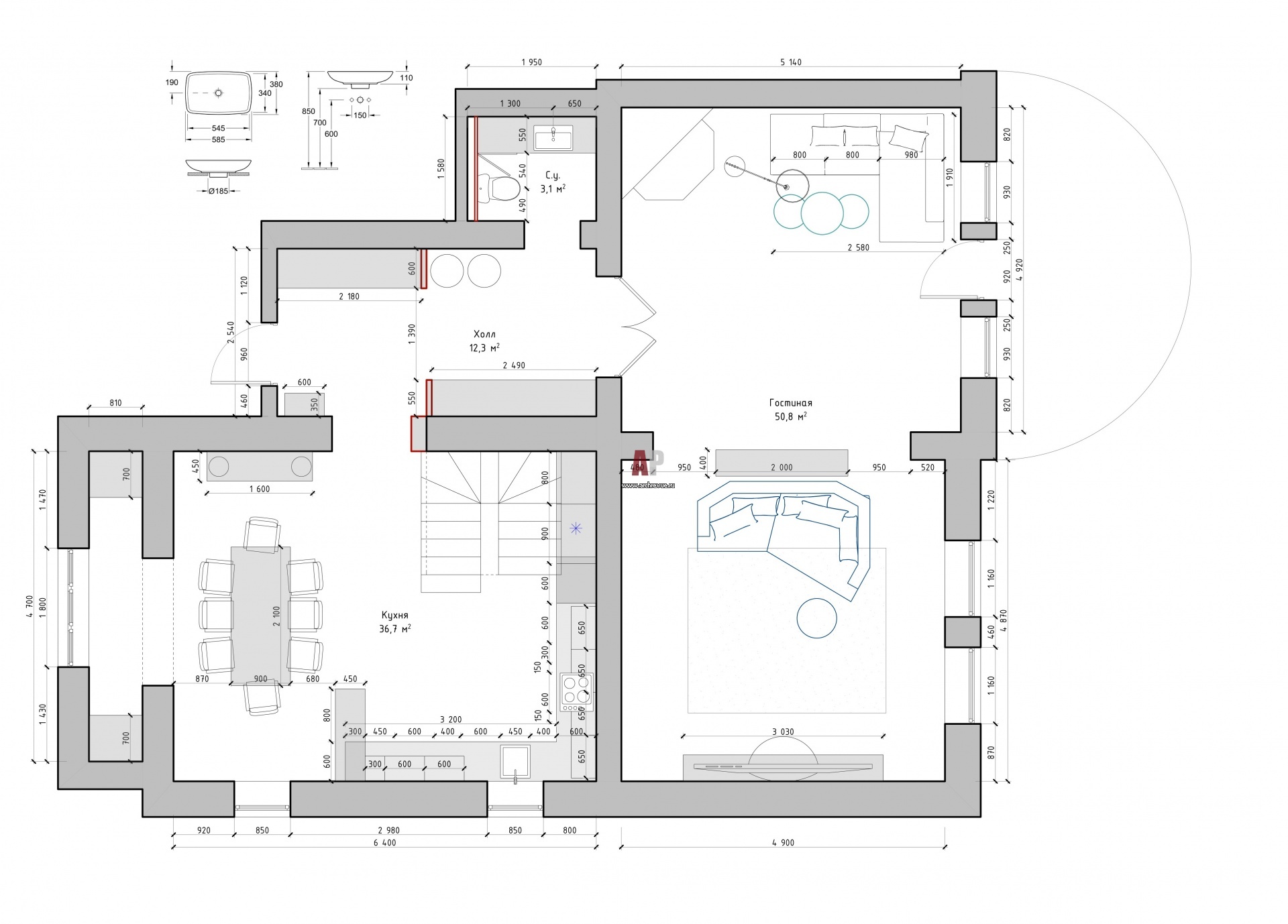 План первого этажа двухэтажной реконструированной исторической виллы в Калининграде. Общая площадь – 180 кв. м.
