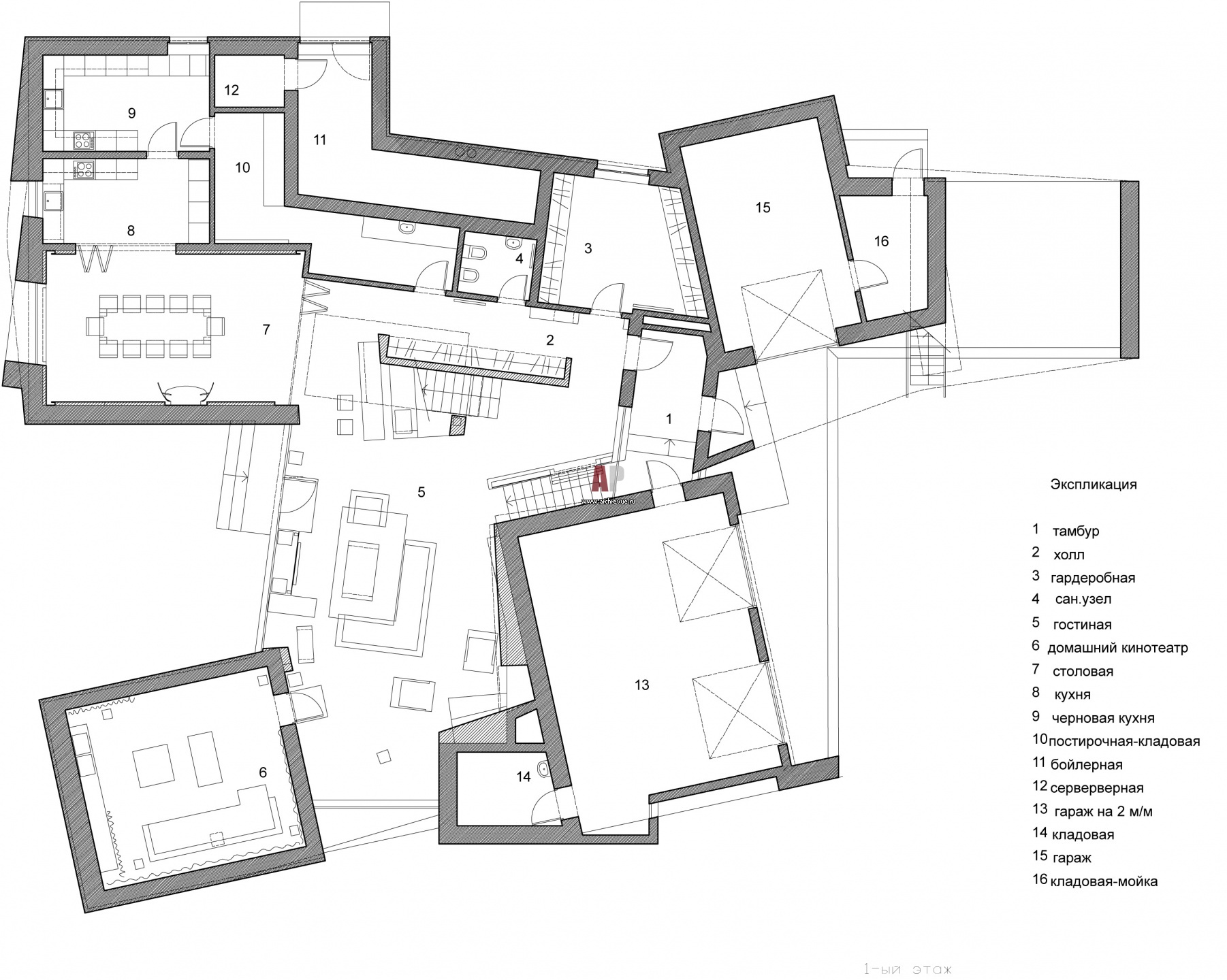 Планировка 1 этажа 2-х этажного дома со сложной геометрией.