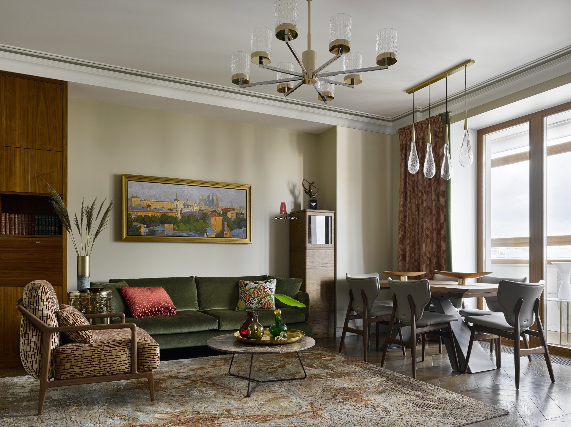 Интерьер квартиры с элементами ретро. Диван и журнальный столик, DiTre Italia. Кресло, Selva. Встроенный шкаф с откидным секретером, на заказ. Люстра, Italamp. На полу инженерная доска, тонированный дуб, уложенная французской елкой.