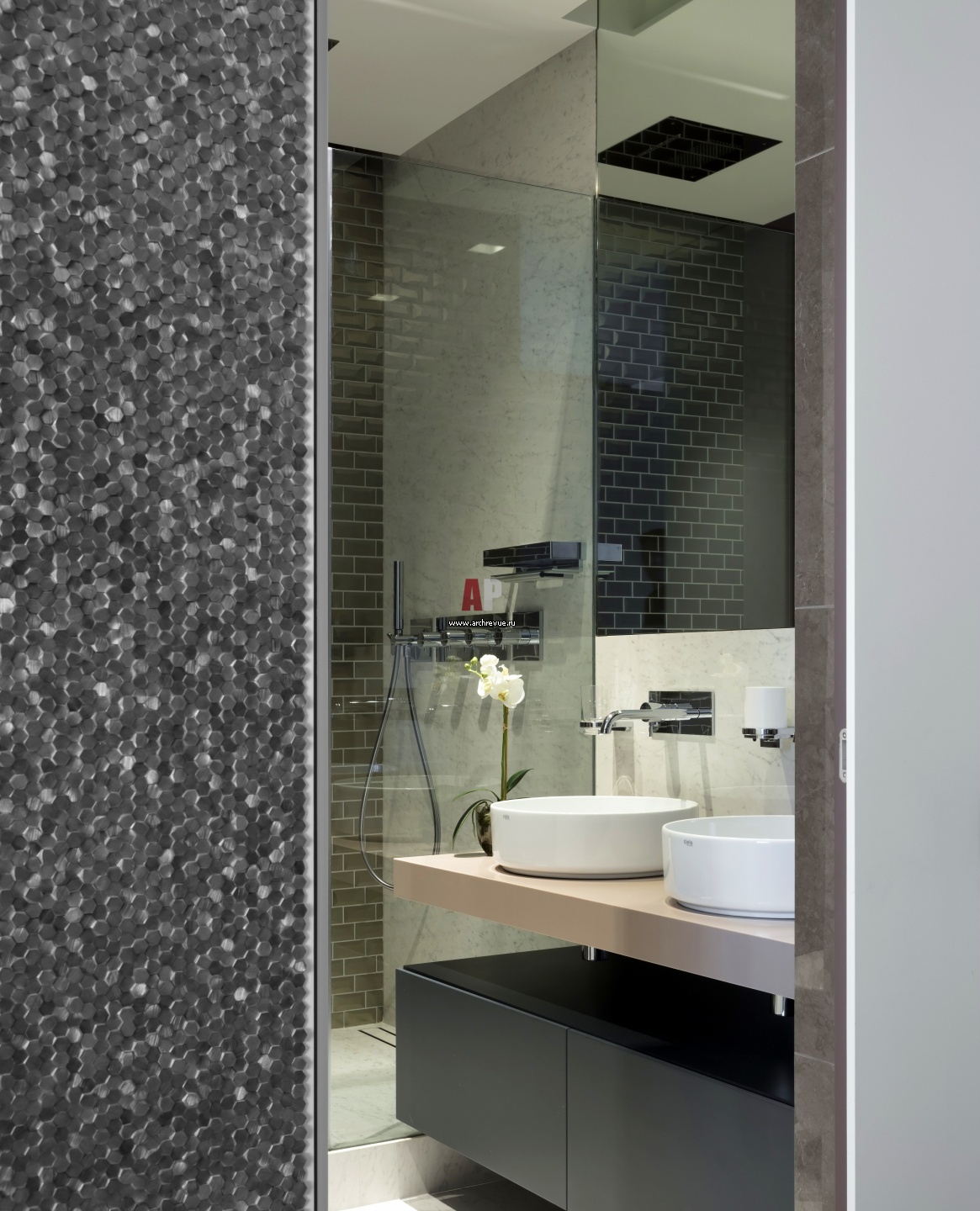 Детский санузел. Зона душевой облицована плиткой Appiani. Пол, стена за умывальником – натуральный мрамор. Раковины, Ceramica Cielo. Подвесная тумба под умывальник, Antonio Lupi.