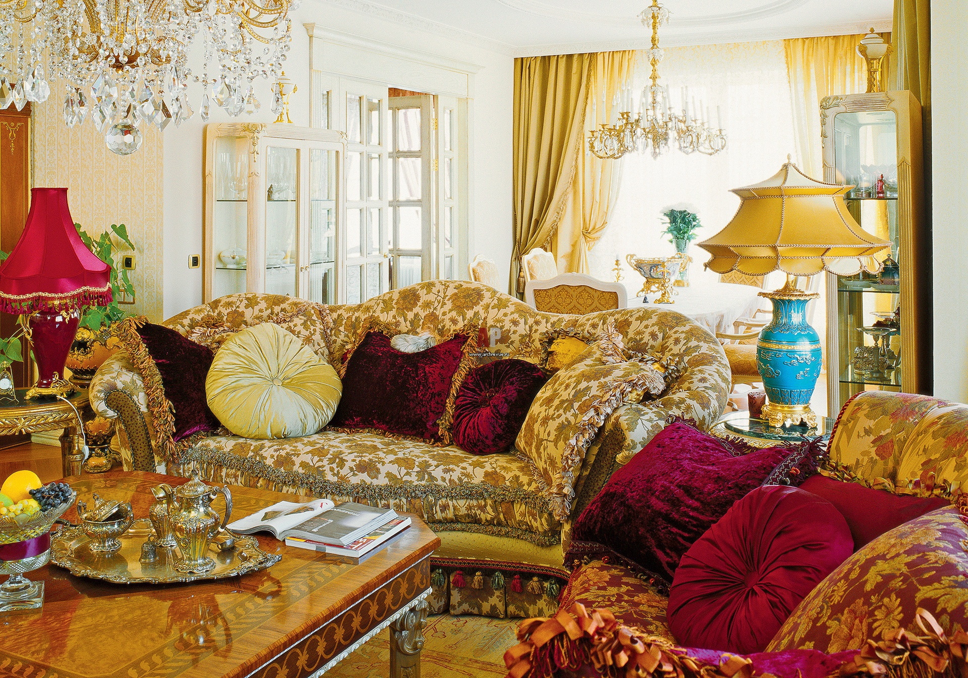В цветовой палитре гостиной присутствуют золотисто-бордовые оттенки, которые традиционно ассоциируются с дворцовой классикой. Бордовый бархат, золотой атлас, красное дерево, бронзовая поталь, хрусталь, антикварный фарфор – все это работает на образ интерьера с плотным, подробным декором.