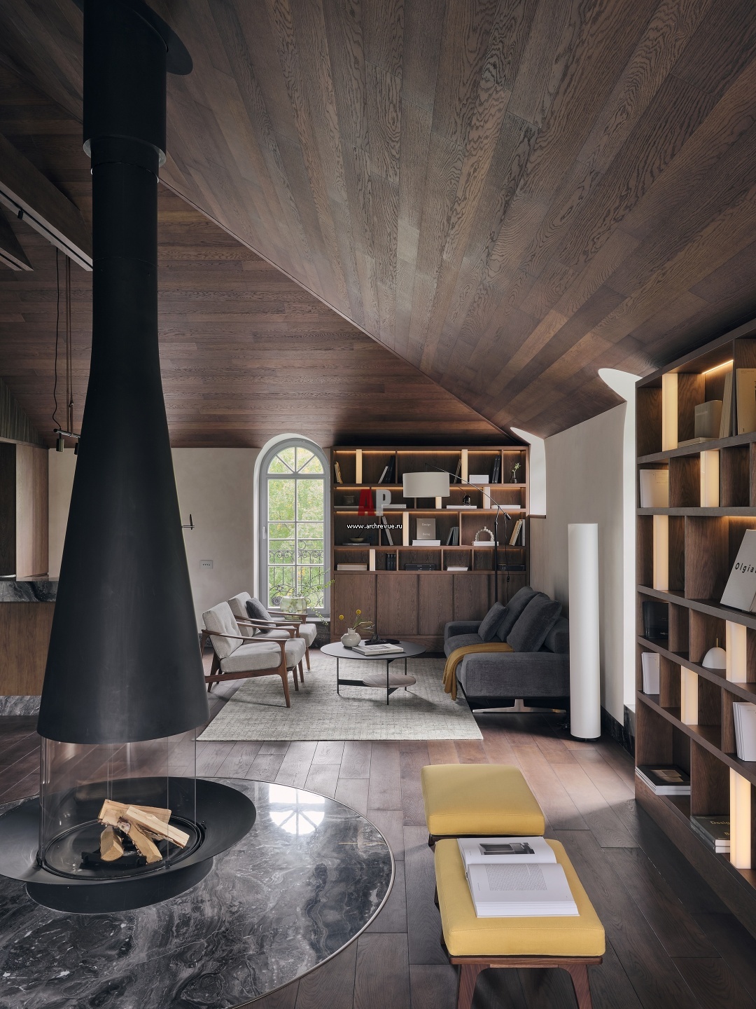 Мансарда для гедониста. Интерьер гостиной с панорамным камином. Пол и наклонный потолок покрыт изготовленной на заказ паркетной доской из дуба разной ширины и длины. Стены окрашены декоративной штукатуркой с мягкой фактурой, разработанной опытным итальянским мастером специально для этого проекта.