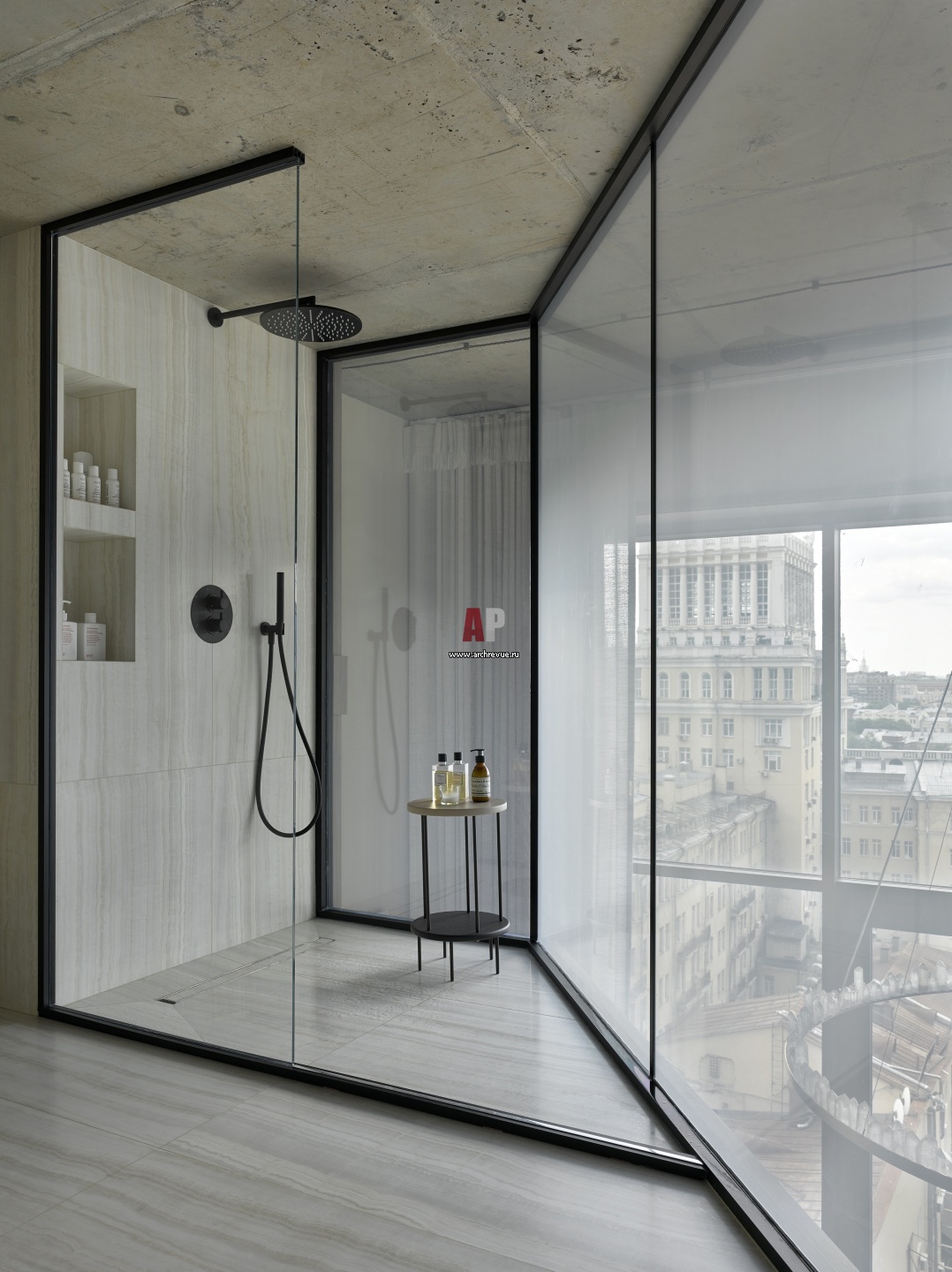 Душевая сделана продолжением спальни. Стекло с функцией затемнения. Столик, Wittmann.