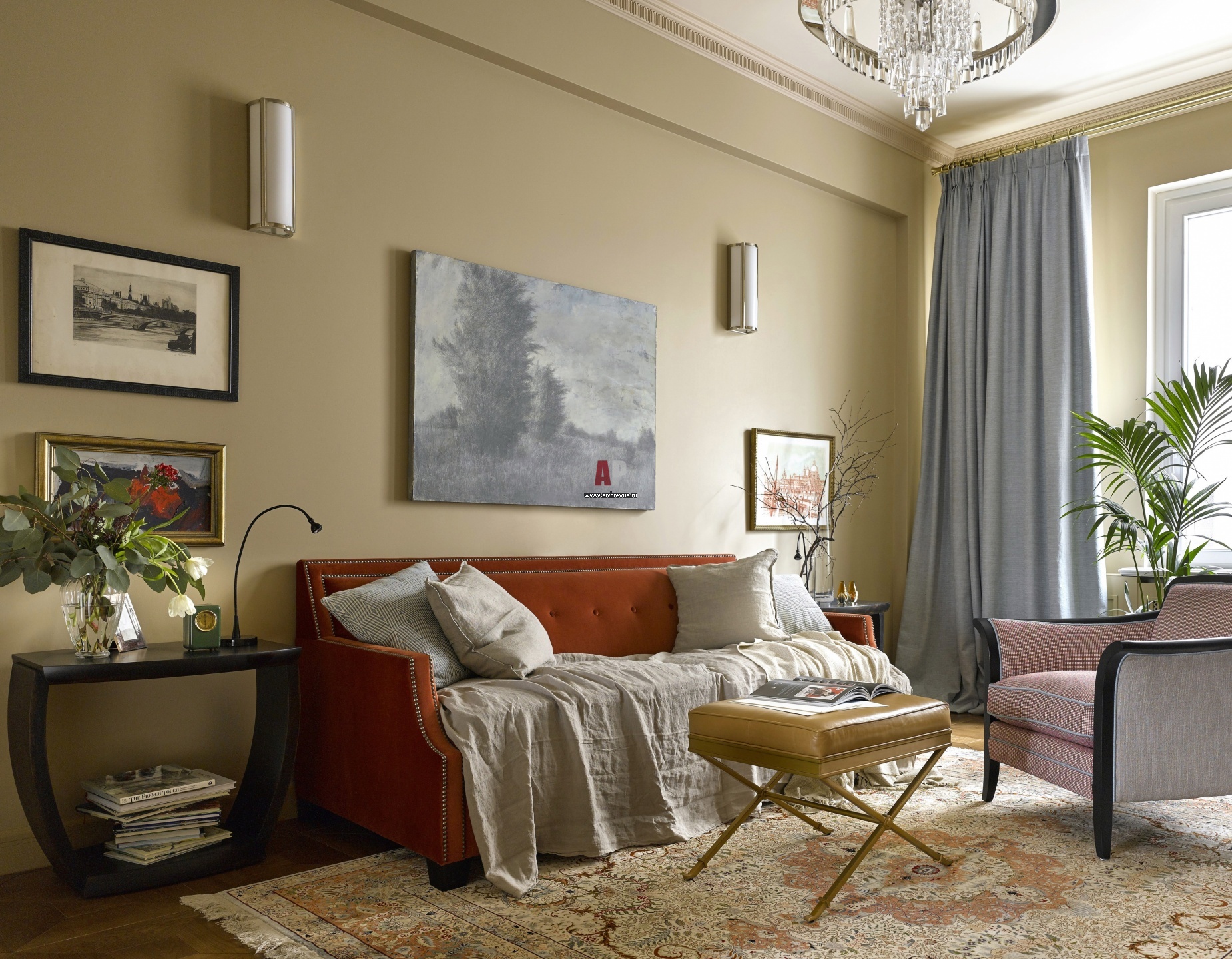 Гостиная выполнена в традиционном американском стиле. Люстра, Corbett Lighting.