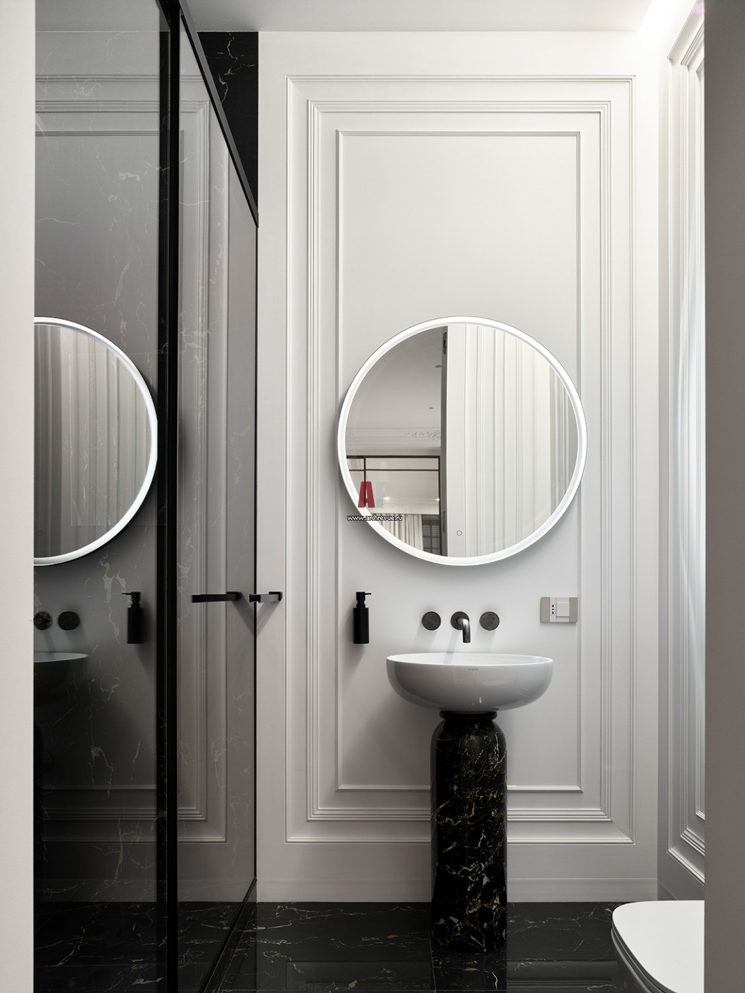 Небольшой гостевой санузел. Напольная раковина, ArtCeram по цвету и текстуре совпадает с керамогранитом, Mirage, Jewels Black Gold. Смесители, Fantini.