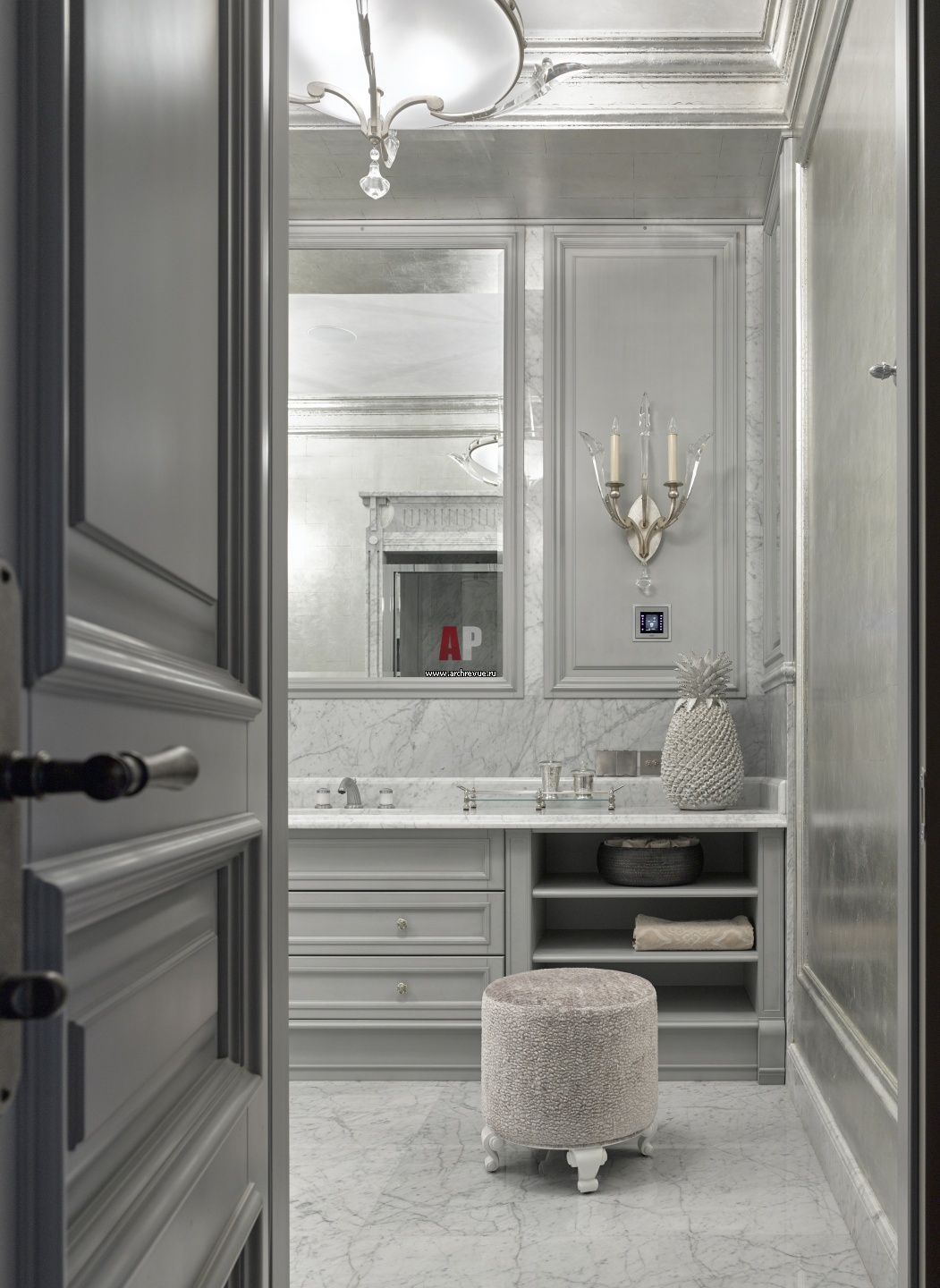 Интерьер хозяйской ванной комнаты в жемчужно-серебристой гамме.