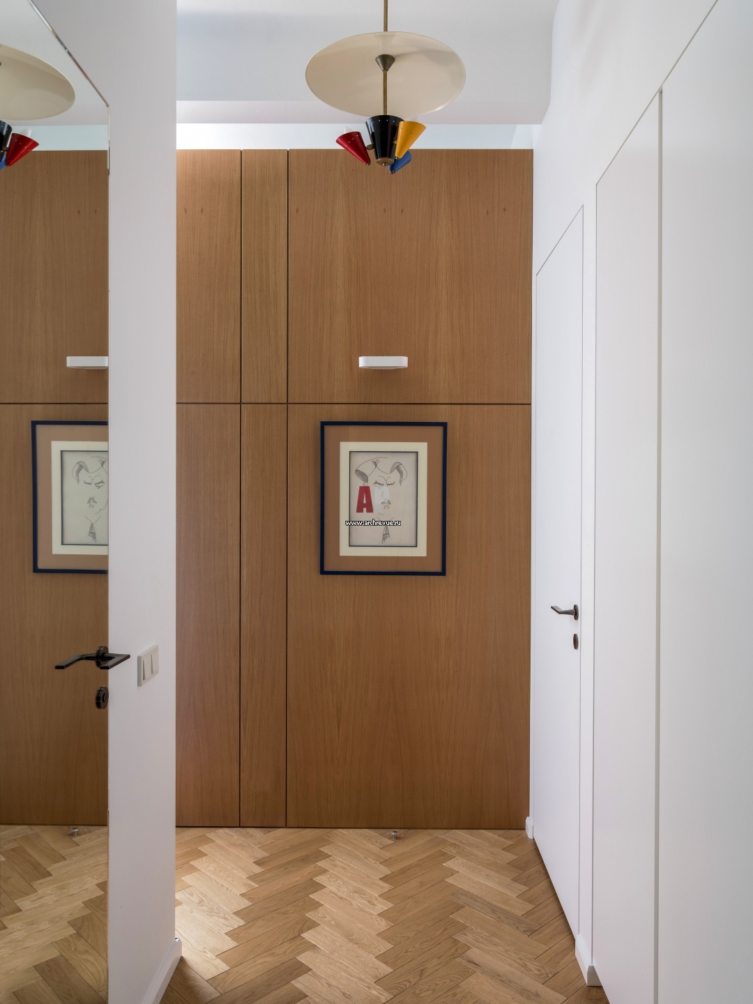 Брутальная квартира для девушки. Интерьер прихожей. За деревянными панелями скрыта система хранения и кухонная техника.