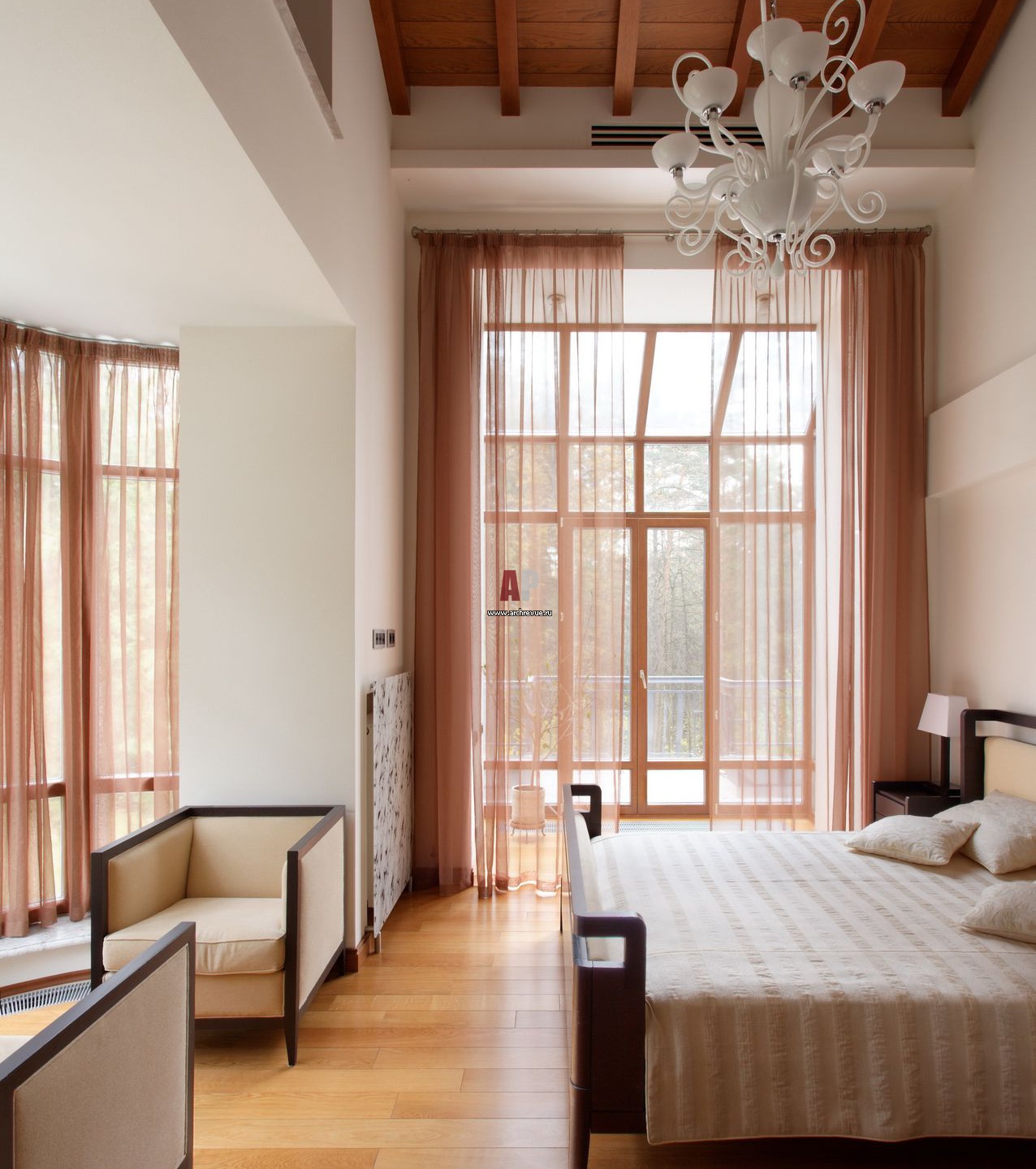 Помещение имеет вытянутые в высоту пропорции и большие плоскости эркерного остекления. Благодаря этому возникает ощущение легкого, наполненного воздухом и светом пространства. Потолок частично обшит деревянными досками по деревянным балкам.