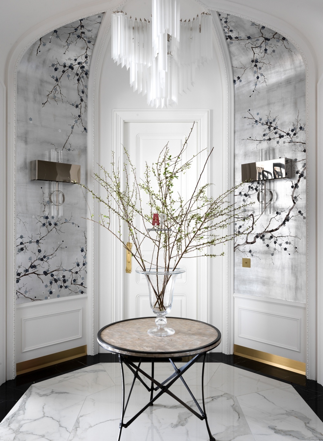 Особенность планировки – центральный восьмигранный холл. Потолок выполнен потолок в виде свода, а стены-грани грани оклеены обоями с ручной росписью по серебряной потали. Люстра, Eichholtz. Бра, Global Views.