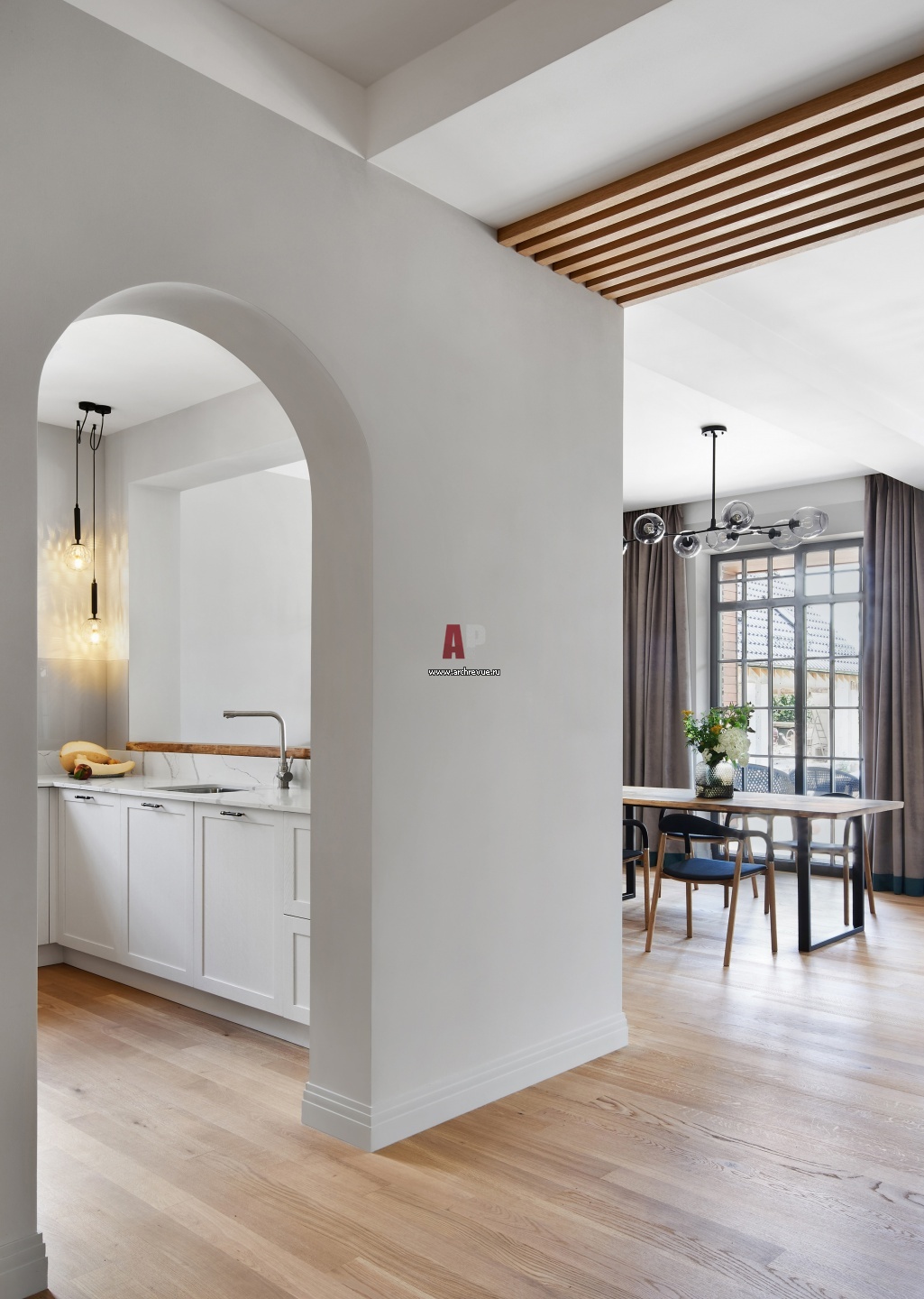 Проход на кухню сделан открытым, чтобы было удобно наблюдать за детьми и общаться с гостями.
