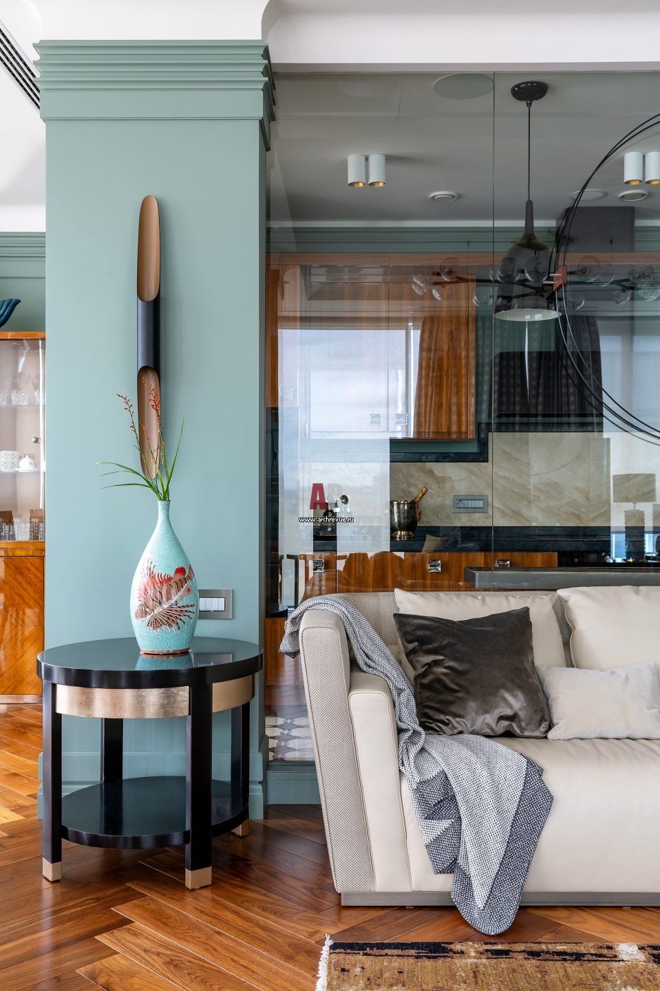 Панорамная квартира с бирюзовыми стенами и элементами ар-деко. Интерьер гостиной. На полу – паркет, французская елка, массив ореха.