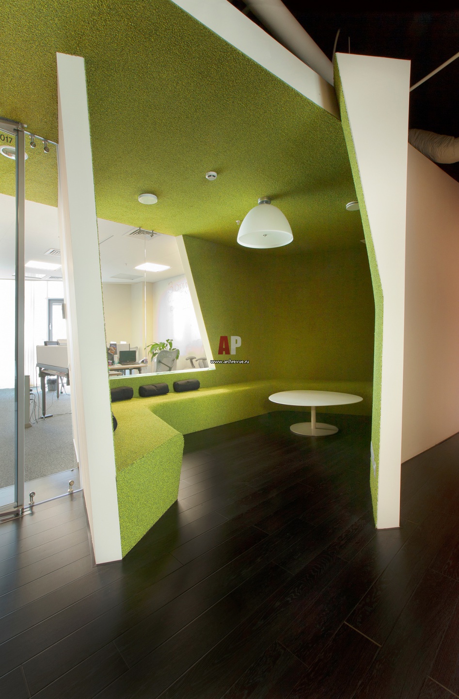 Фрагмент интерьера зоны для отдыха и неформального общения. Зеленый ковролин, InterFace FLOR. Авторы проекта Петр Зайцев, Арсений Борисенко, архитектурное бюро za bor.