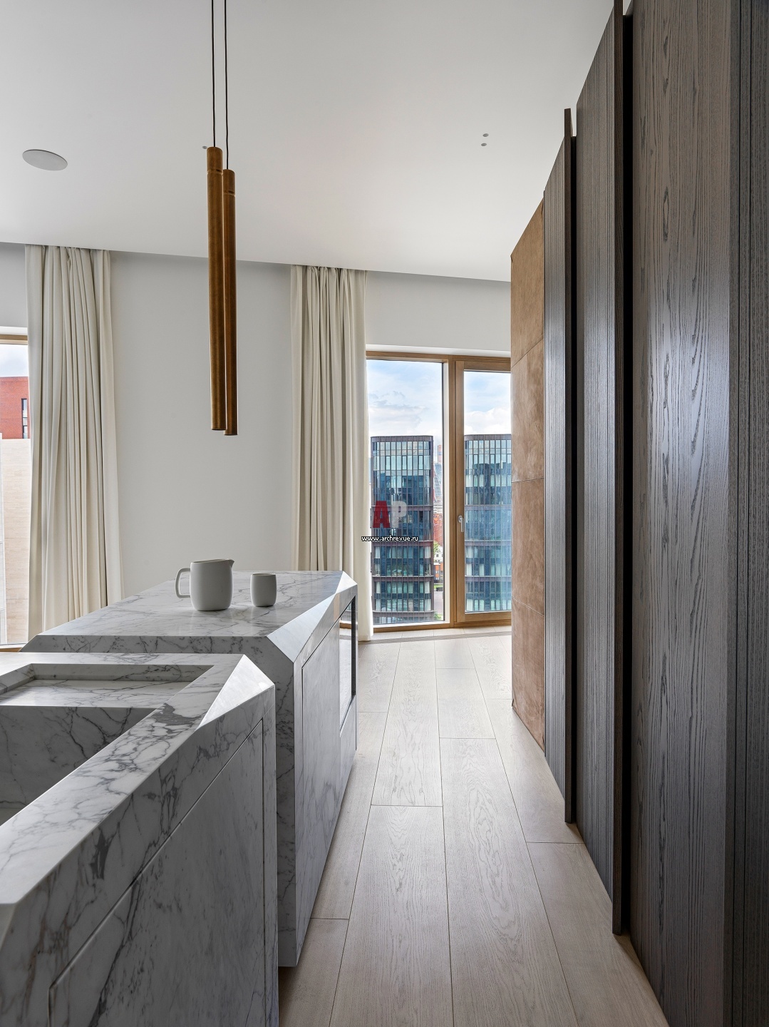 Интересные перспективы, открытые виды на панорамные окна и городскую перспективу – отличительные черты проекта. За деревянной перегородкой находится рабочая часть кухни.