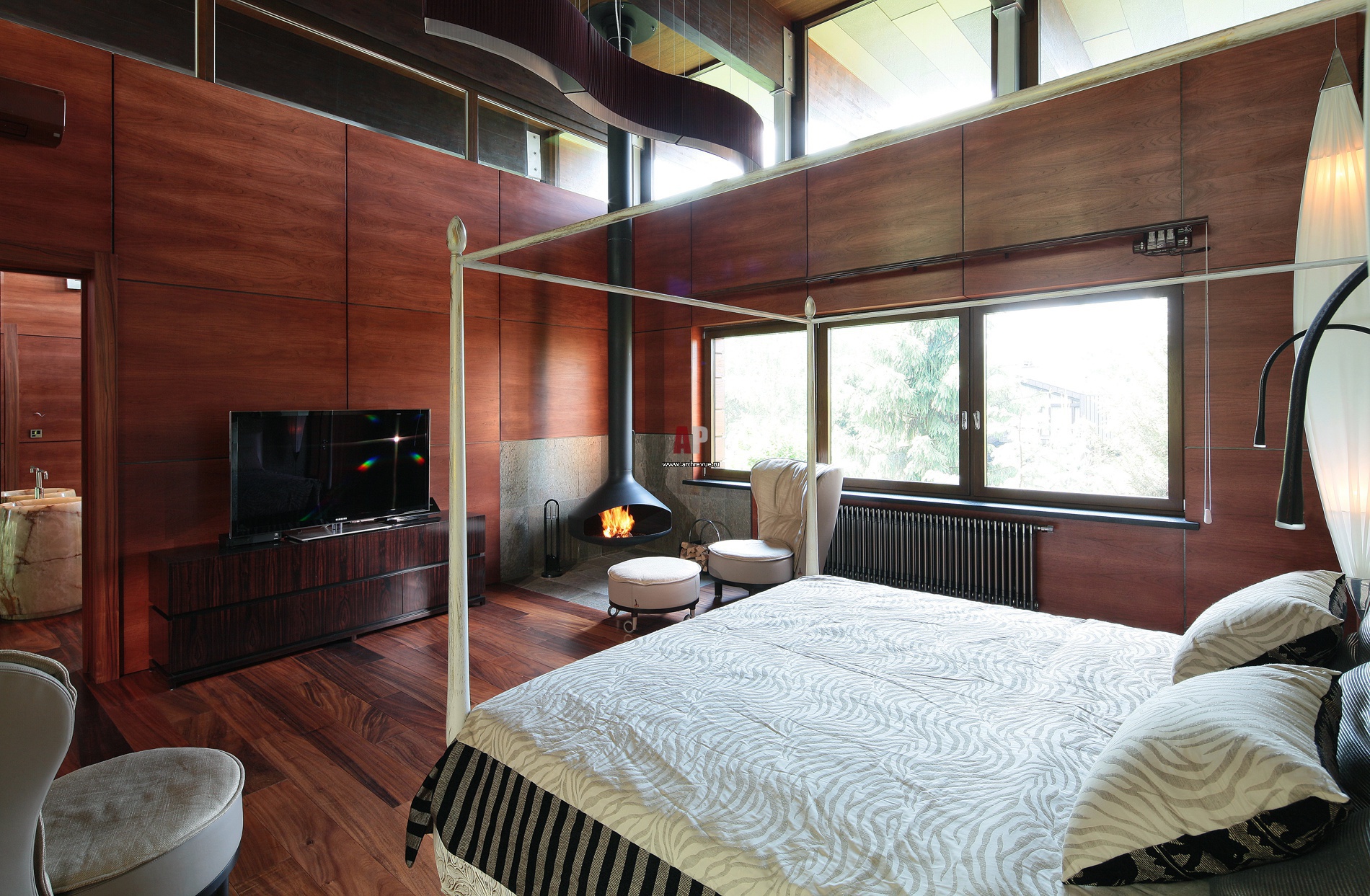 Стены в спальне зашиты деревянными панелями из японской яблони, изготовление «СОФИЯ-ДЕКОР». Угол камина отделан ониксом. Камин Ergofocus, Focus.
