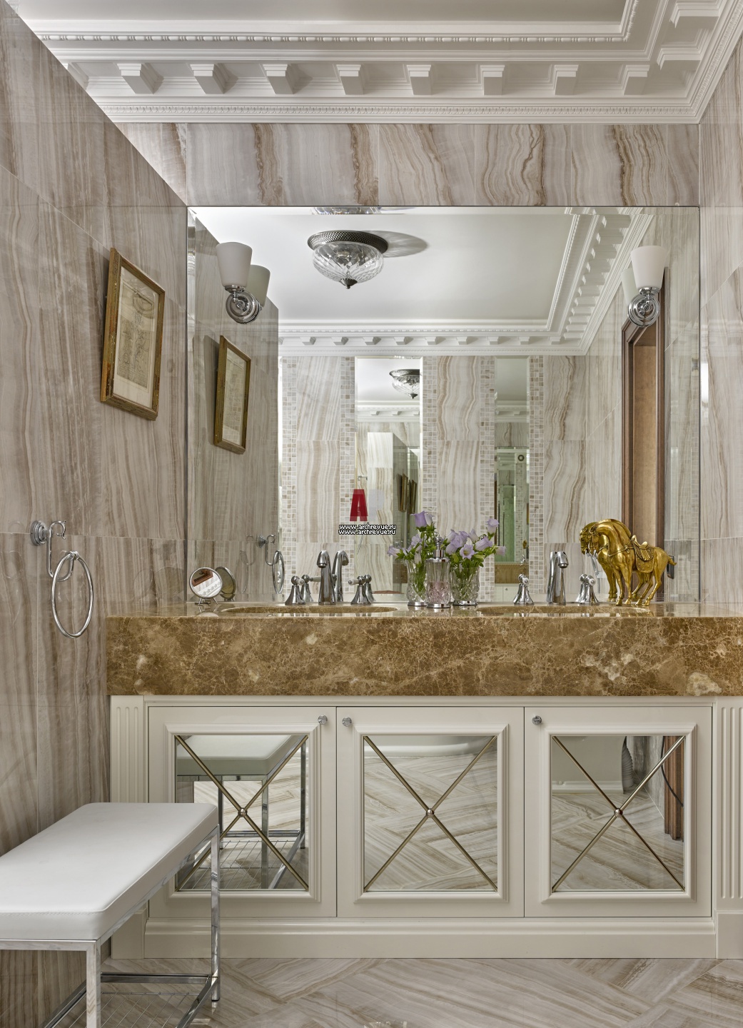 Стены и пол в ванной комнате выложены ониксом. Встроенная мебель, «СОФИЯ-ДЕКОР».