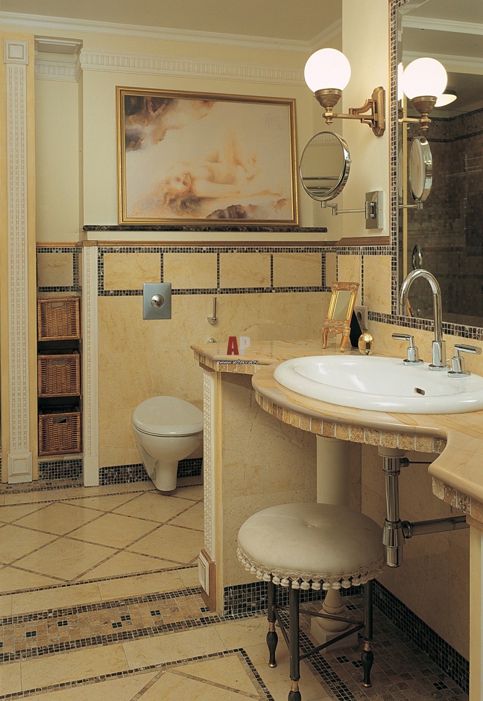 Интерьер санузла. Отделка мозаикой Sicis из натурального камня с эффектом старения. Столешница из полированного мрамора.