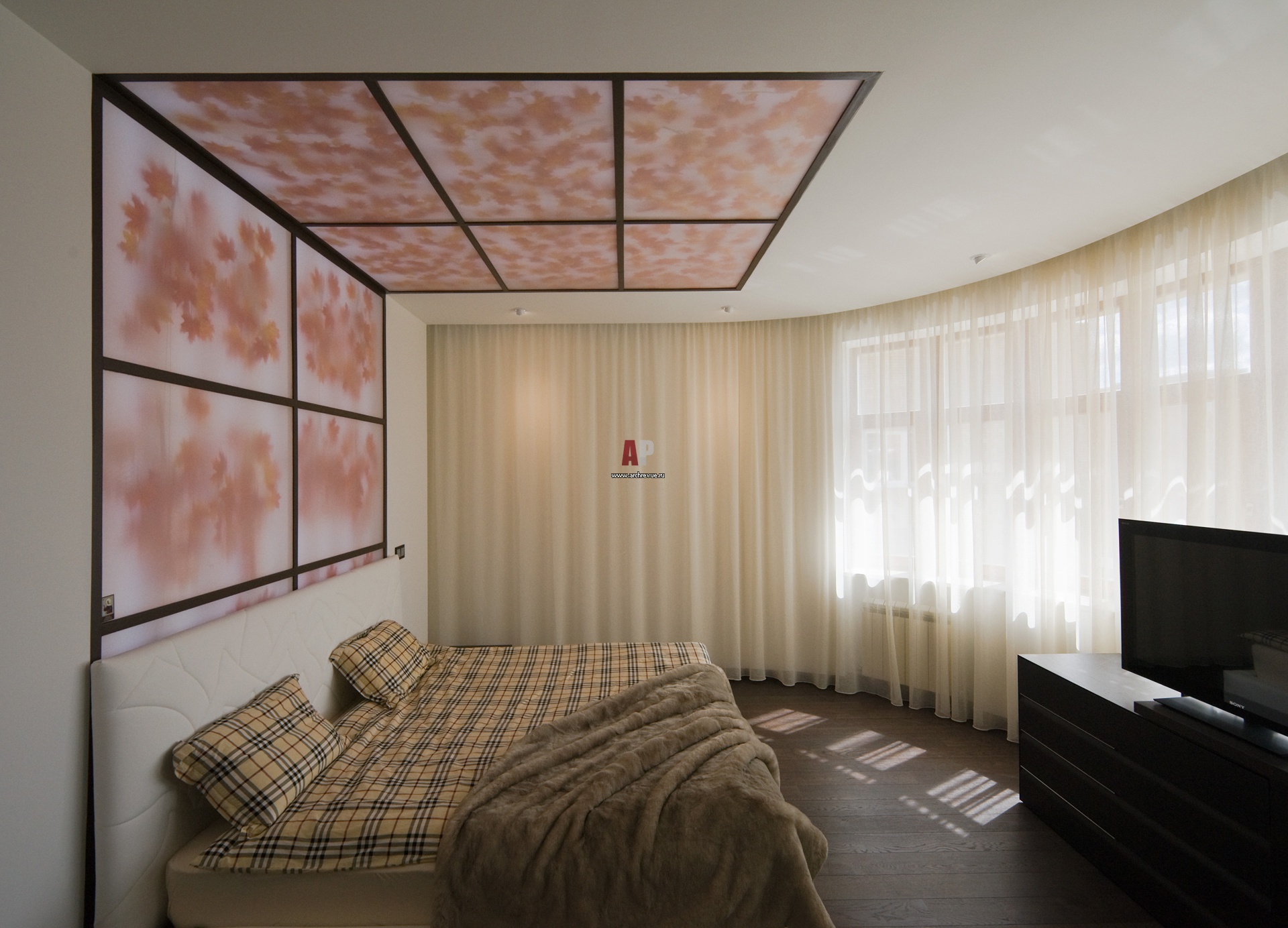 Фото интерьера современной спальни. На декоративных панелях из матового стела изображены кленовые листы.
