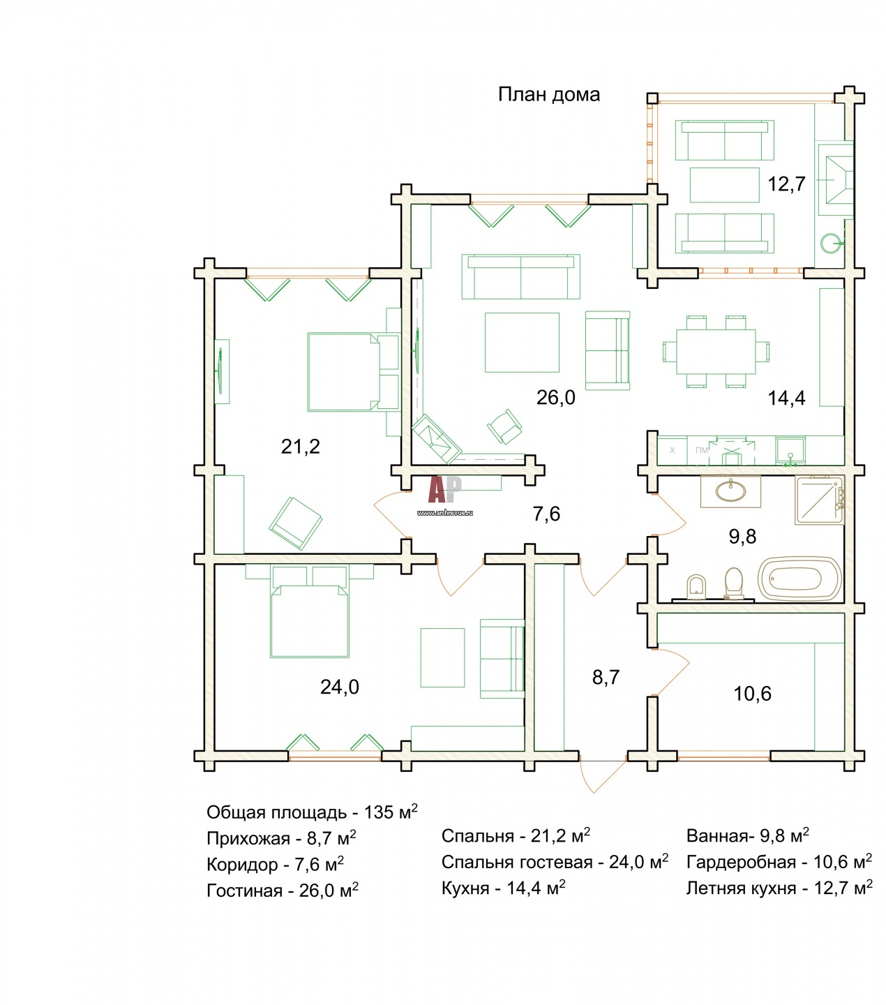 План небольшого деревянного коттеджа площадью 130 кв. м.