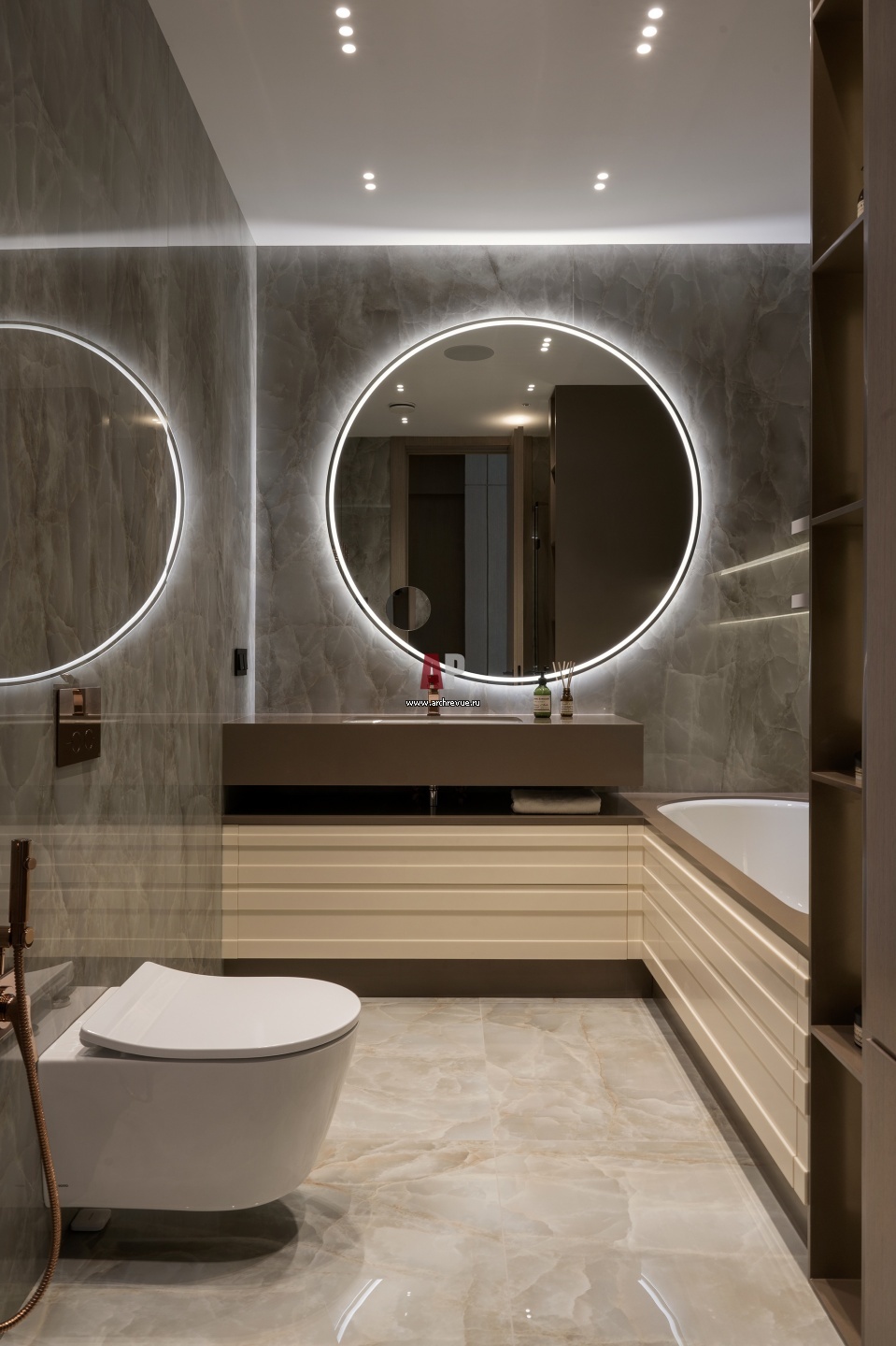 Ванная комната дочери. Фасады шкафа под раковиной, переходящие в борт ванны, выполнены из искусственного камня по эскизам дизайнера. Смесители, Gessi. Зеркало, Antonio Lupi. Стены отделаны керамогранитом, имитирующим оникс пепельно-серого цвета.