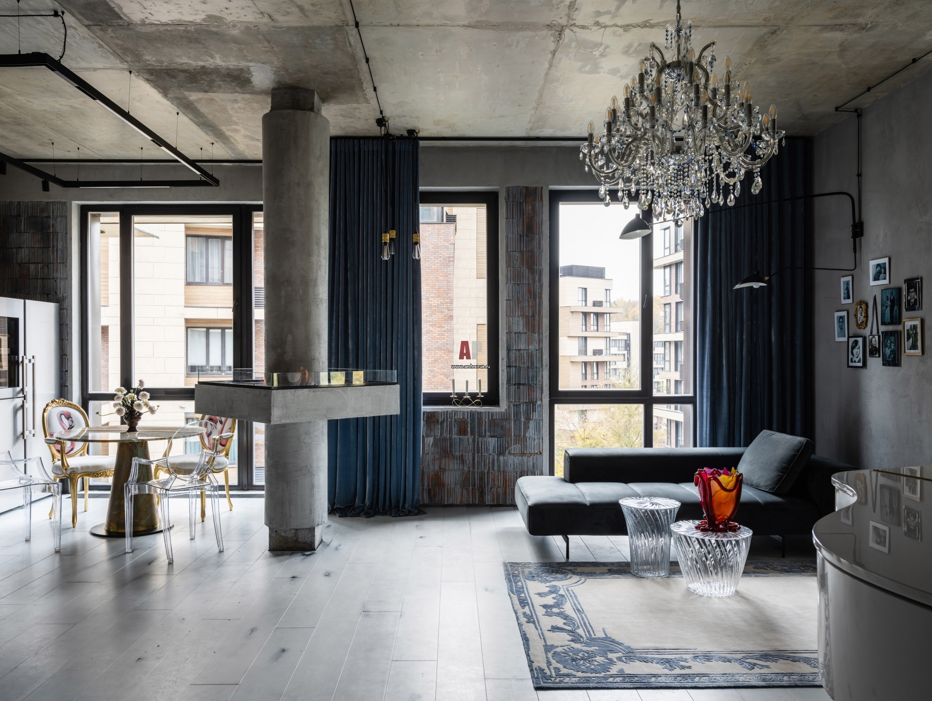 Украшение брутального интерьера – хрустальная люстра Masiero. Она выполнена по эскизам дизайнера, за основу была взята классическая форма бренда «Мария Терезия». Хрусталики выполнены в нежно-васильком цвете. С ним гармонируют портьеры из синего шелкового бархата, Henry Bertrand.