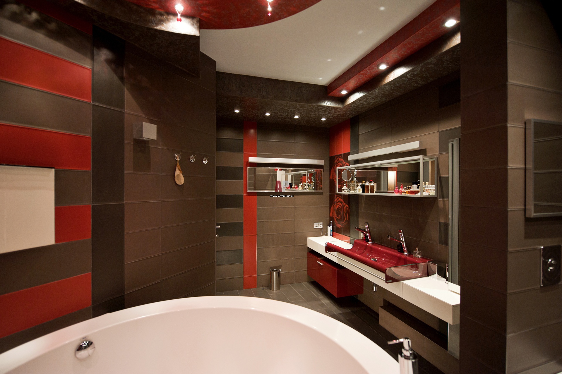Хозяйский санузел в черно-красной цветовой гамме. Умывальник выполнен из красного тонированного в массе стекла. На стене – керамическое панно с изображением красных роз.