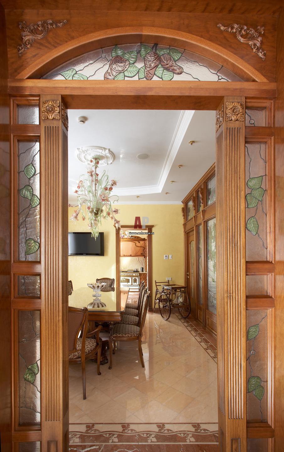 Акцентом интерьера столовой стал растительный орнамент, воплощенный в мраморном рисунке на полу, в резных деревянных фрагментах и в витражных элементах дверного портала. Яркое решение – витражная стена, отделяющая столовую от холла. Витражи Борис Тумов, компания «Том Глас».