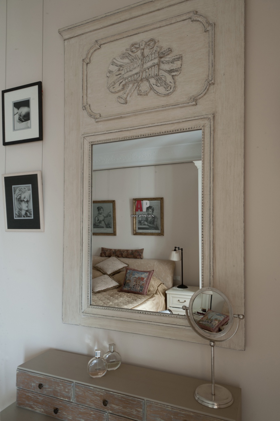 На фото – фрагмент интерьера спальни с элементами стиля Прованс. Зеркало в патинированной раме, Mis en Demeure.