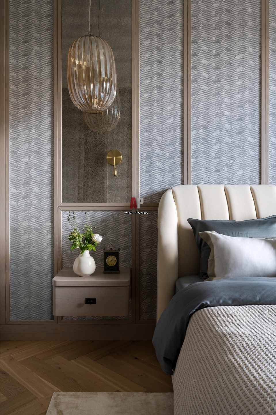 Интерьер спальни. Ощущение уюта от плотных тканей с геометрическим рисунком усиливают тонкие деревянные рейки и состаренные зеркала.