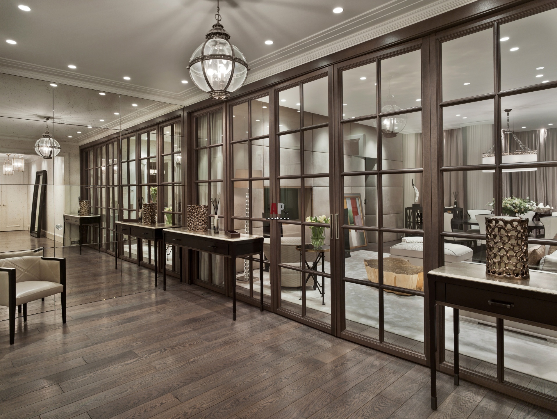 Перегородка из стекла с дубовыми переплетами между холлом и гостиной и шкаф из состаренного зеркала сделаны на заказ по эскизам авторов проекта. Кресло, Bolier. Консольный столик, Baker.