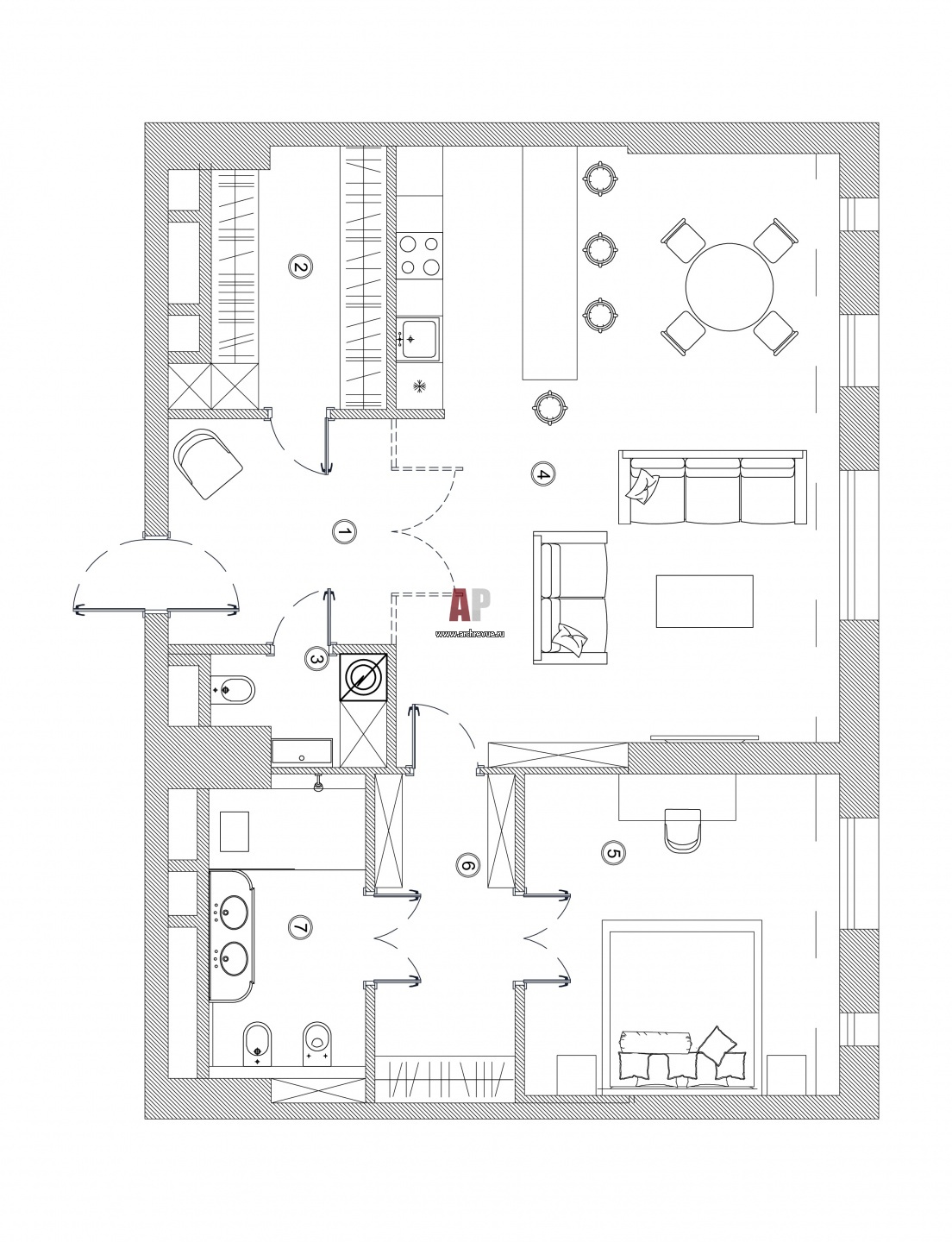 План 2-х комнатной квартиры для молодого человека. Общая площадь: 96 кв. м.