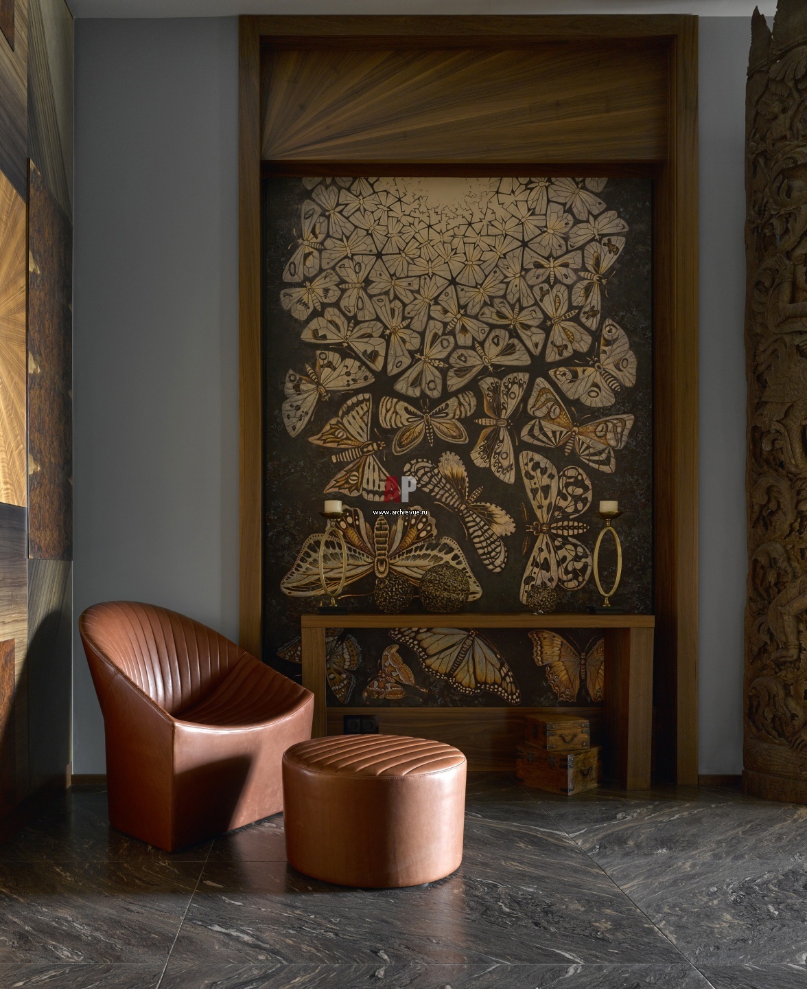 Интерьер прихожей. В нише размещена картина художника Андрея Смирнова, выполненная по мотивам работ Маурица Эшера. Консоль сделана на заказ. Кожаные кресло и пуф, Wittmann.