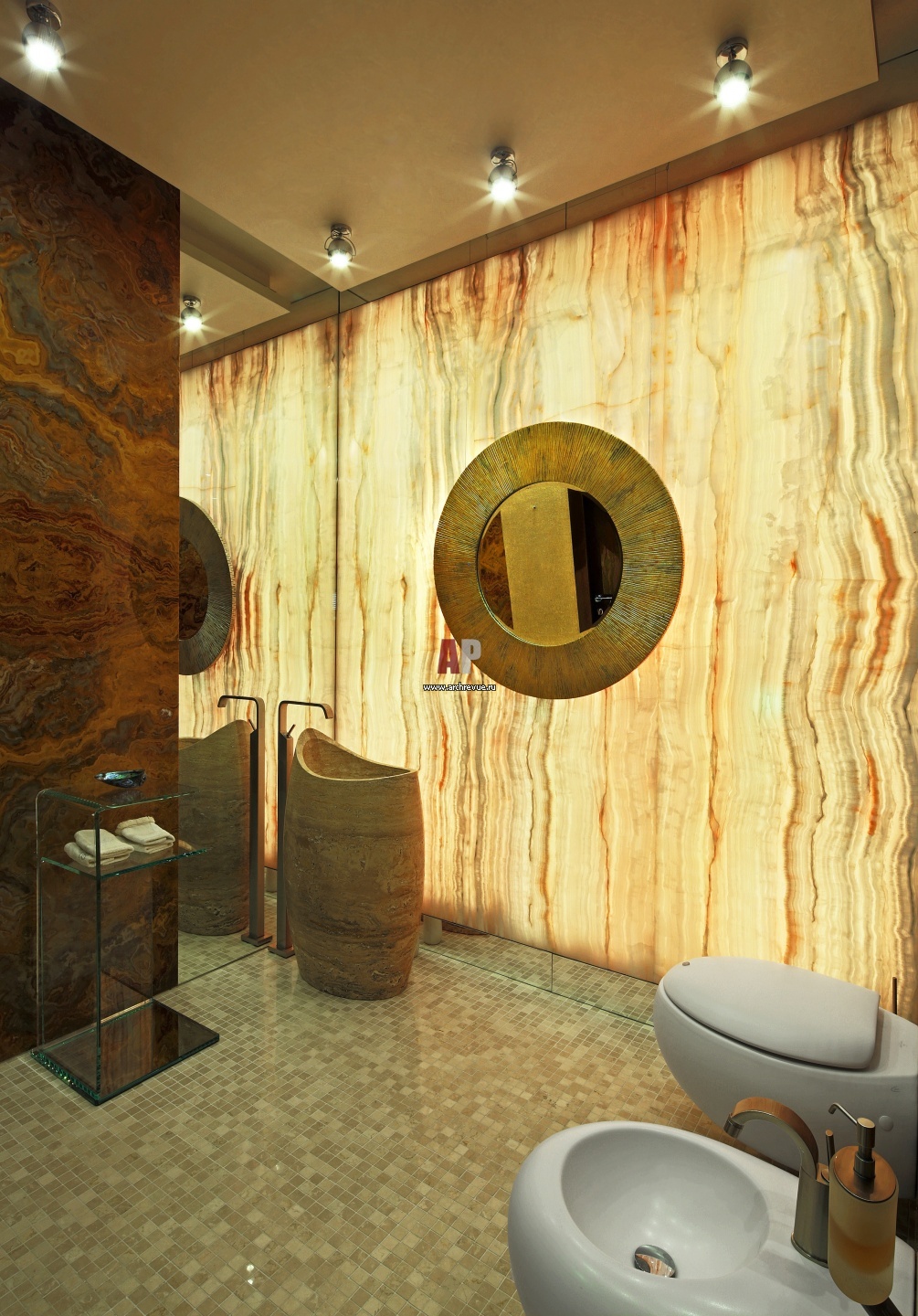 Интерьер гостевого санузла с ониксом в облицовке стен и каменным умывальником.